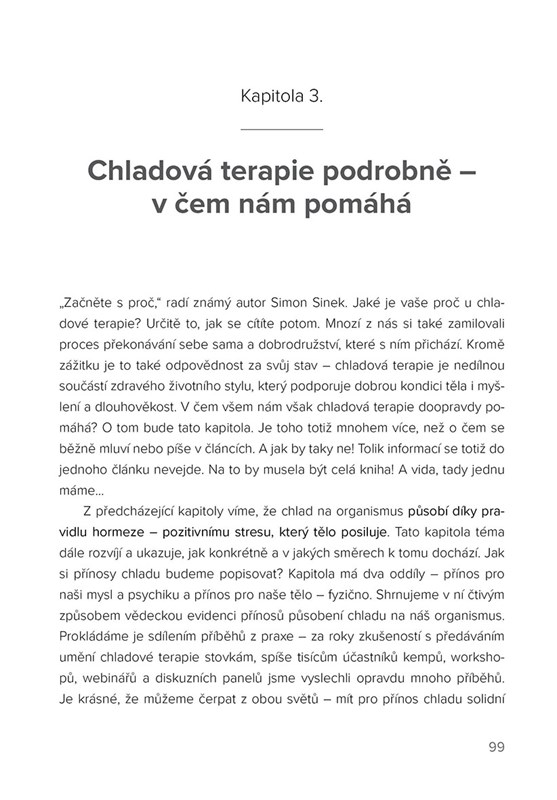 Knížka je o otužování a chladu - o jednom z nejblahodárnějších přátel našeho těla a mysli. Chlad je tu s námi, lidmi (homo sapiens) odpradávna. A díky tomu jsme si na chlad skvěle zvykli. Často si stačí dovolit v hlavě, aby se naše tělo přizpůsobilo a dovolit chladu, aby nám pomohl v nás budovat “nejlepší verzi sebe sama”.