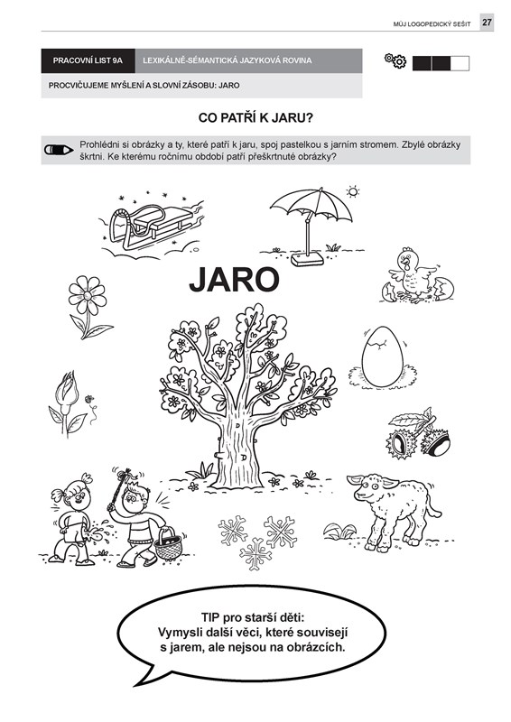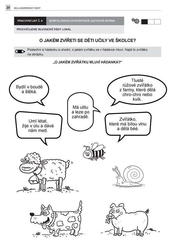 Můj logopedický sešit nabízí hravé a srozumitelné aktivity podporující rozvoj řeči, slovní zásoby, porozumění i správné výslovnosti u dětí od 4 do 6 let. Obsahuje 22 pracovních listů jednodušší úrovně doplněných podrobným metodickým návodem, který vysvětluje, proč je konkrétní jazykovou rovinu vhodné rozvíjet, jak při tom postupovat a jak úkoly přizpůsobit individuálním potřebám dítěte.