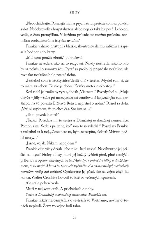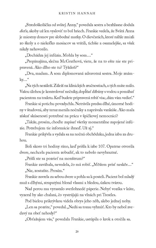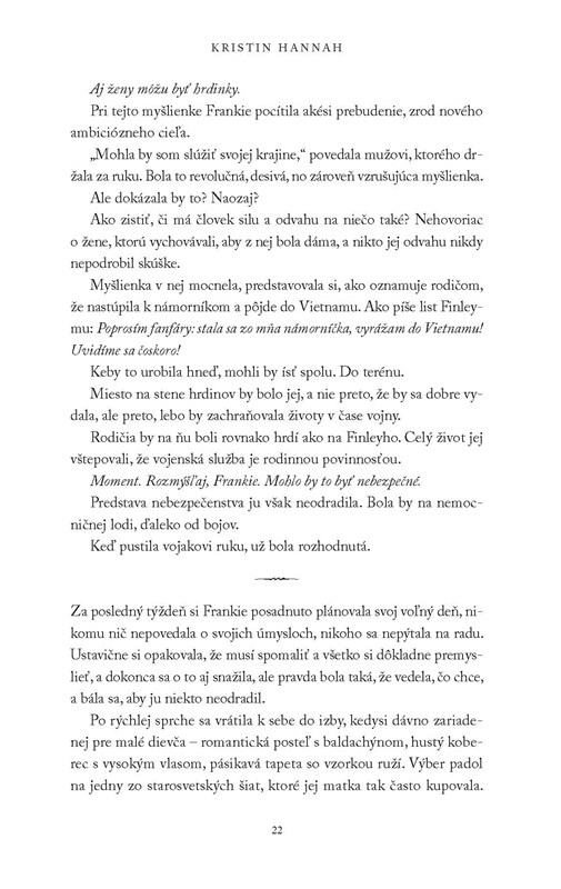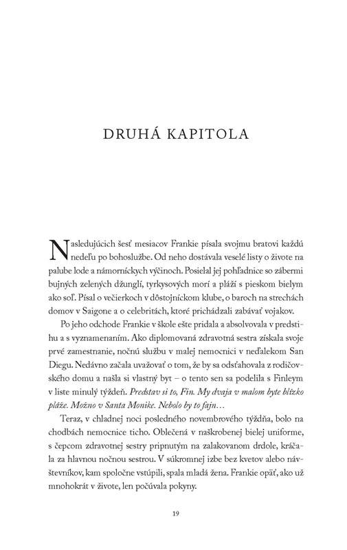 Aj ženy môžu byť hrdinkami. Keď dvadsaťročná študentka ošetrovateľstva Frances „Frankie“ McGrathová počuje tieto slová, je to pre ňu ako zjavenie. Vyrastala v idylickom svete južnej Kalifornie zaliatej slnkom, chránená konzervatívnymi rodičmi, a vždy sa hrdila tým, že robí správne veci. V roku 1965 sa však svet mení a ona sa zrazu odváži predstaviť si pre seba inú budúcnosť. Keď jej brat odíde slúžiť do Vietnamu, vstúpi do armádneho zboru zdravotných sestier a vydá sa po jeho stopách.