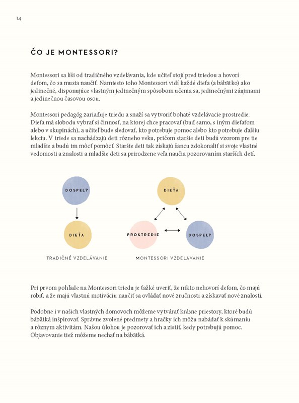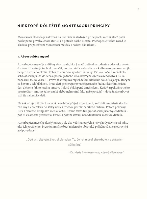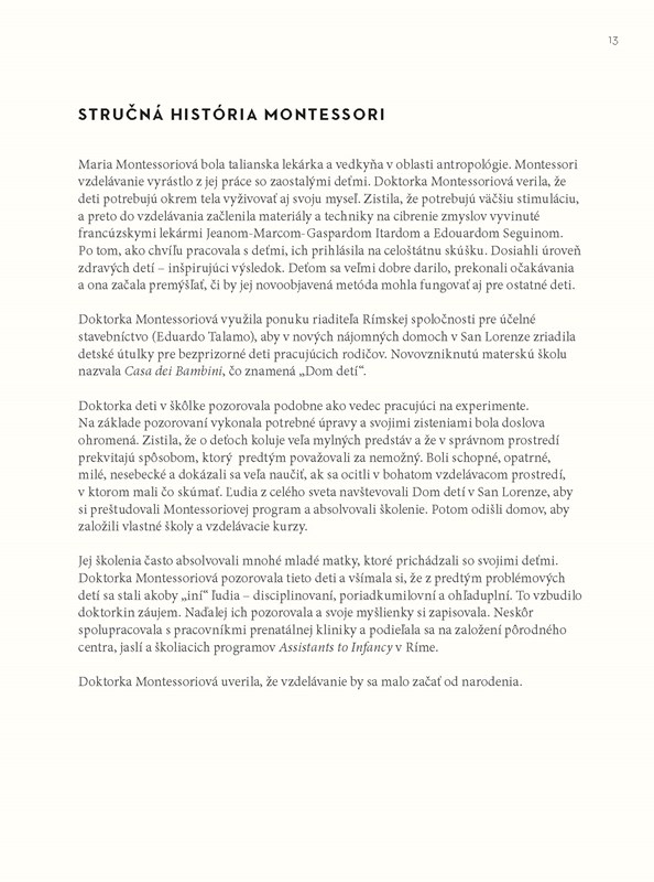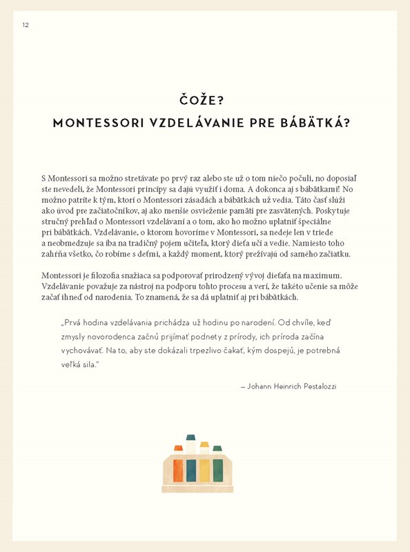 Na základe zásad, ktoré vyvinula pedagogička Dr. Maria Montessori, predstavuje kniha, ako vychovávať svoje dieťa od narodenia do veku jedného roka s láskou, rešpektom, nadhľadom a prekvapivým pocitom pokoja. Kniha od Simone Davies, autorky bestselleru Montessori pre batoľatá, a Junnify Uzodike, obsahuje stovky praktických myšlienok, ktoré vám pomôžu pochopiť, čo sa s vaším bábätkom skutočne deje a ako mu môžete svedomito pomáhať pri učení a rozvoji. V knihe tiež nájdete tipy ohľadom: