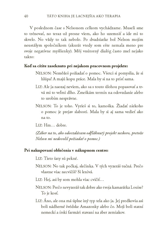 Nájsť dobrého terapeuta je ťažké. A nájsť takého, s ktorým si ešte aj porozumiete a ktorý nezruinuje vašu peňaženku, je ešte zložitejšie. V príručke Táto kniha je lacnejšia ako terapia skúsená psychoterapeutka Liz Kelly prináša terapiu priamo k vám. Hoci teda nemáte peňazí nazvyš, poisťovňa vám neprepláca sedenia, nedarí sa vám nájsť kvalitných lekárov alebo ste uviazli na čakacej listine, už teraz sa môžete cítiť lepšie.