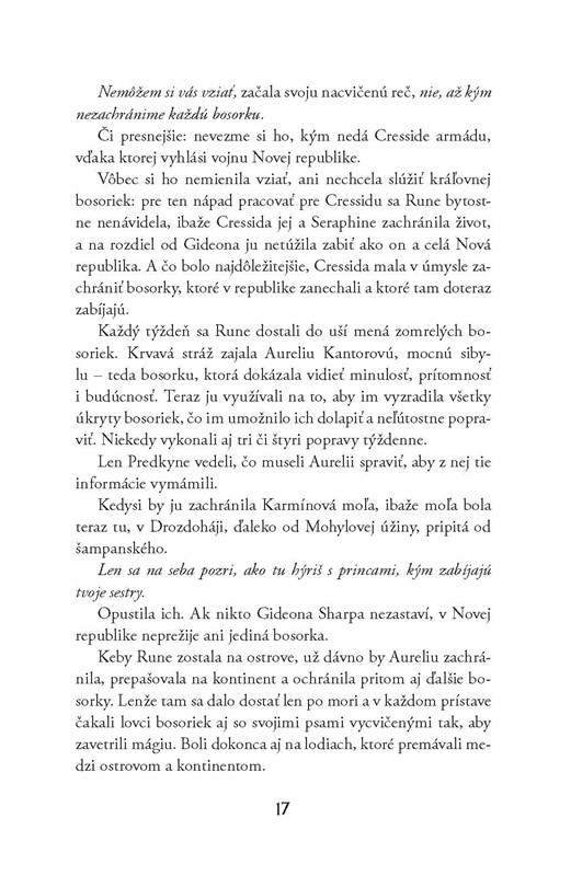 Rune Wintersová je na úteku. Odkedy Gideon Sharpe, chlapec, ktorého milovala, odhalil jej pravú identitu a odovzdal ju do rúk nepriateľa, všetci túžia po jej smrti. Ak chce Rune prežiť, musí sa spojiť s krutou a nebezpečnou Cressidou, ktorá plánuje znovu nastoliť vládu bosoriek – v čom Rune zohráva kľúčovú úlohu.