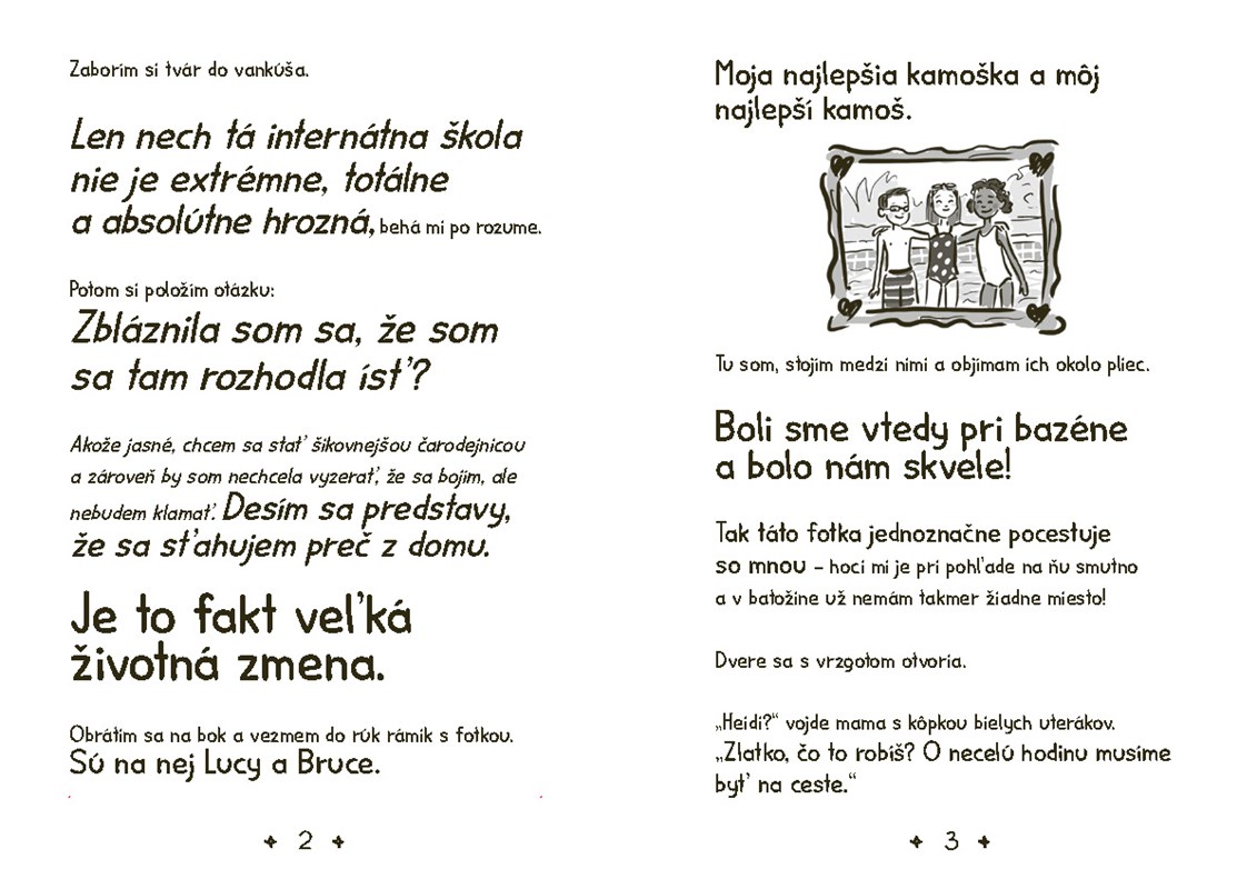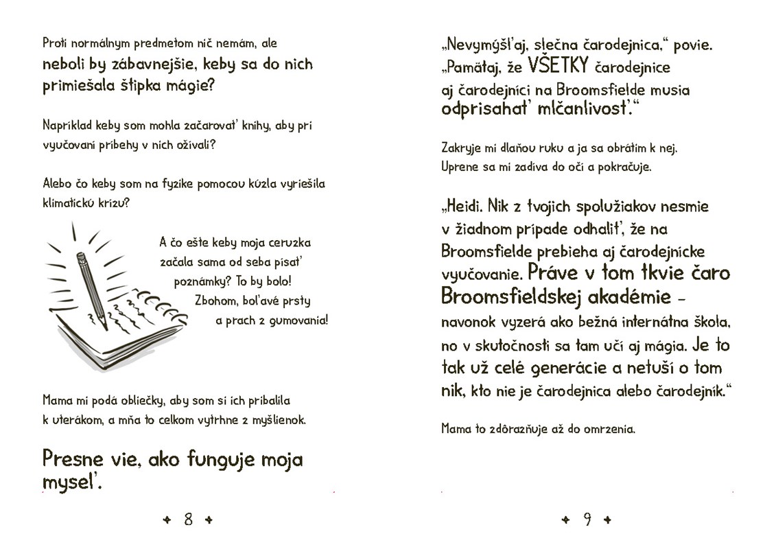 Volám sa Heidi Heckelbecková a asi ma porazí. Nastupujem na druhý stupeň a hlavne prestupujem na Broomsfield – jedinú akadémiu, kde sa tajne vyučuje mágia. Neskutočne sa teším, ale zároveň som totálne nervózna. Nájdem si tam kamošky? Akú budem mať spolubývajúcu? A čo ak sa ukáže, že čarodejnice a čarodejníci, ktorí tam študujú, čarujú lepšie ako ja?