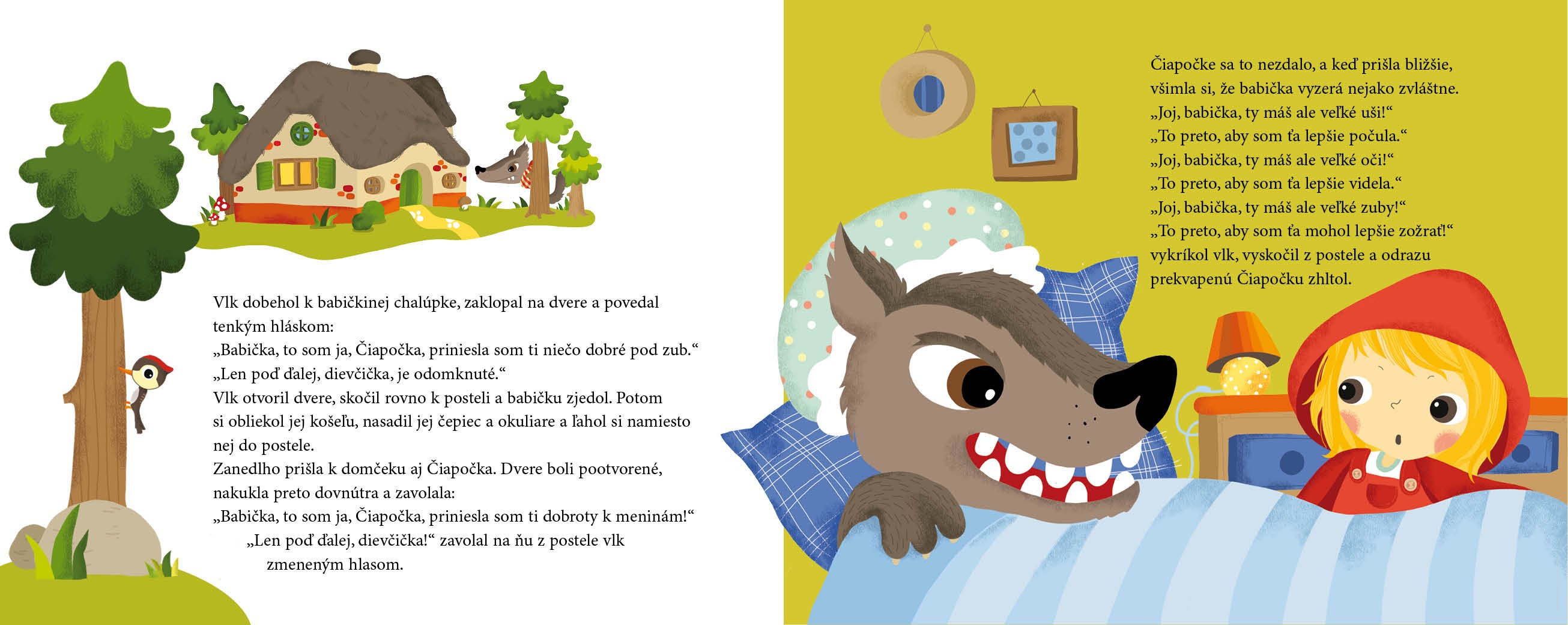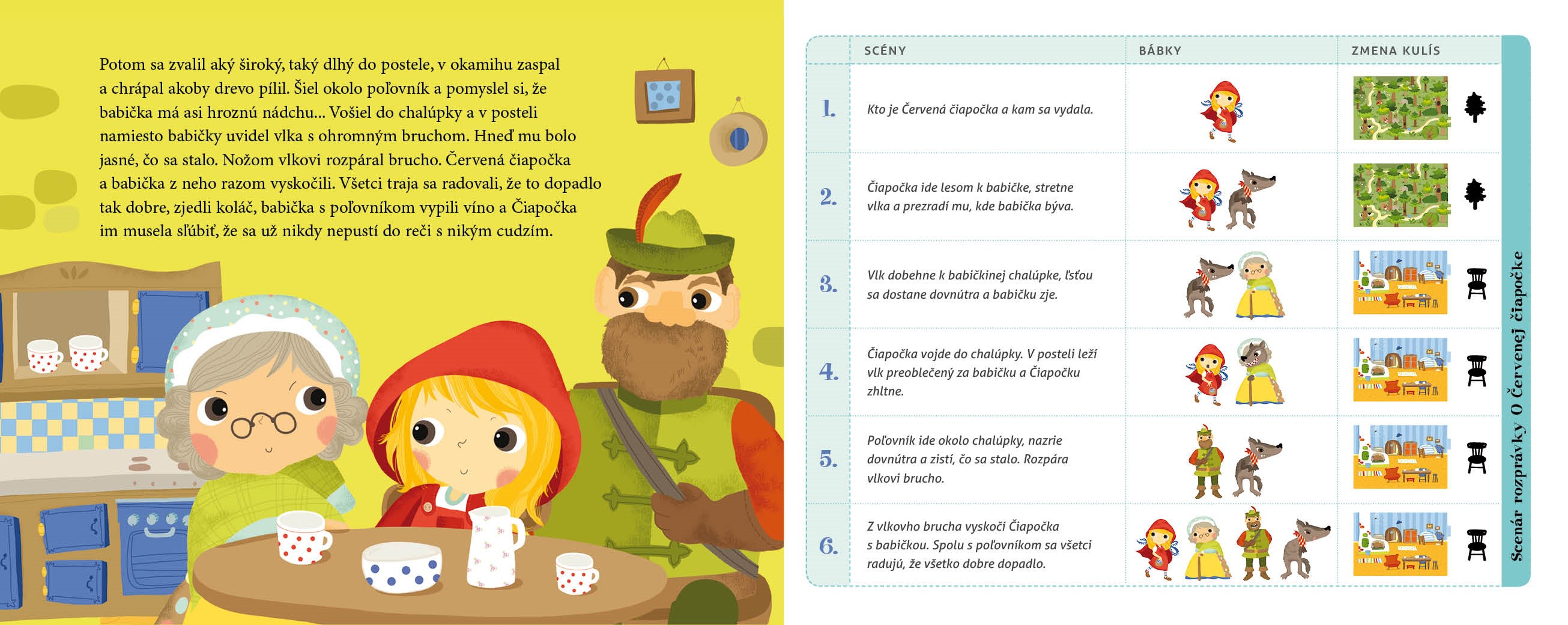 vlk, Červená čiapočka, babička, vlk preoblečený za babičku, poľovník, prasiatka, kozliatka, vrece s kozliatkami, koza
