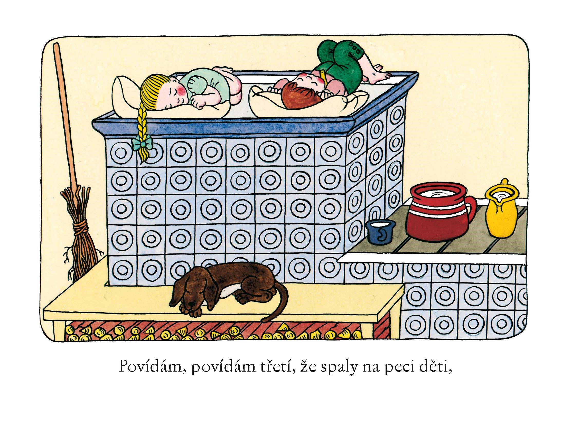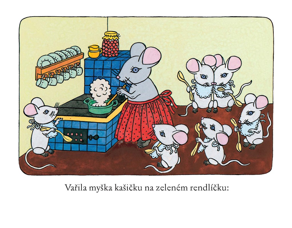 Leporelo s textem tří lidových říkadel – Vařila myška kašičku, Paci, paci, pacičky a Povídám, povídám pohádku – doprovázených půvabnými obrázky.
