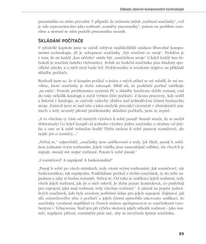 Tím je dán také cíl této knihy: vysvětlit principy komponentní technologie na její nejrozšířenější podobě, známé pod zkratkou COM (Component Object Model), která umožňuje programátorům přejít k tvorbě softwaru způsobem, jenž dá výrobě charakter skládání součástek. Přínos této knihy, průkopnické v našich podmínkách a dosti ojedinělé i ve světovém měřítku, spočívá nejen v tom, že vás v podrobném výkladu s řadou příkladů a paralel z reálného světa zasvětí do tajů COMu, ale i v tom, že tuto programátorskou technologii aplikuje na konkrétní programovací jazyk. Ilustrativní ukázky tvorby a použití komponent, s nimiž dojdete až k vlastní komponentně vytvořené aplikaci, jsou programovány ve Visual Basicu, nejrozšířenějším a dobře použitelném jazyku. Ať má kdokoli v oblibě C++ nebo jiné možné prostředky, důvodem této volby, jak autoři – zkušení programátoři – uvádějí, byla snaha „nedělat věci složitější, než jaké jsou“. V příručce zaměřené na vyvíjení efektivních a snadno pochopitelných programů bylo toto řešení logické.