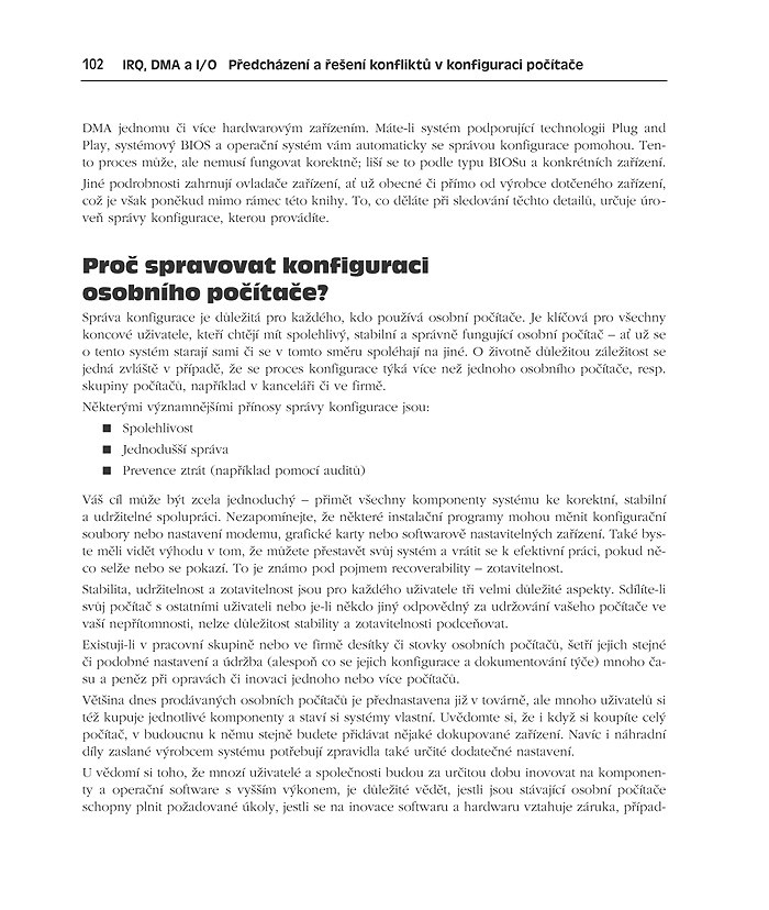 Nastavení parametrů všemožných komponent počítače je úkol, s nímž se setká většina lidí, kteří si musí při své práci poradit bez pomoci specialistů. Do této pro laika takřka sebevražedné akce se spousta z nás pouští dokonce i dobrovolně v touze po lepší funkčnosti svého počítače. V této knize naleznete rady týkající se všech počítačových součástí, se kterými se v běžné praxi setkáte. Jsou zde popsány standardní architektury, technologie a vstupně/výstupní zařízení používaná v současných osobních počítačích postavených na platformě PC. Kniha vám bude sloužit jako kompletní průvodce pro odstranění kolizních konfigurací počítače, a to v prostředích od MS-DOS, přes Windows 95/98 až po Windows NT. Naleznete zde potřebné informace o úpravě registrů operačních systémů Windows, technologiích a standardech PCI, Plug and Play, USB a mnoha dalších.