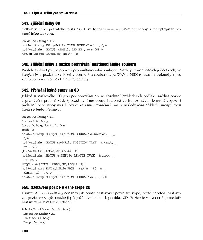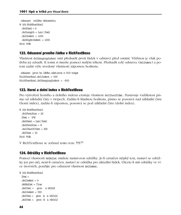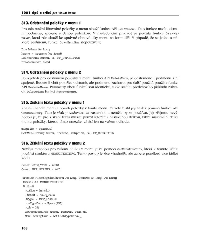 Každému, kdo již má s programováním zkušenosti, je jasné, že naprogramovat lze všechno, takže v knize pravděpodobně neobjeví nové horizonty, může si však ušetřit hodiny drahého času a stovky programových řádek namísto vymýšlení toho, co už jednou bylo vymyšleno a vyzkoušeno. Autoři, kteří se všemožným programátorským problémům snaží přijít na kloub již několik let a svá důmyslná řešení dosud publikovali v časopisech, se zde zaměřili na postupy, které lze realizovat prostředky přímo nabízenými Visual Basicem, objektovými knihovnami různých technologií nebo knihovnami, jež jsou součástí Windows. Každý tip představuje vždy úzce vymezený problém a je miniaturní lekcí vysvětlovanou krok po kroku na ukázce programového kódu.