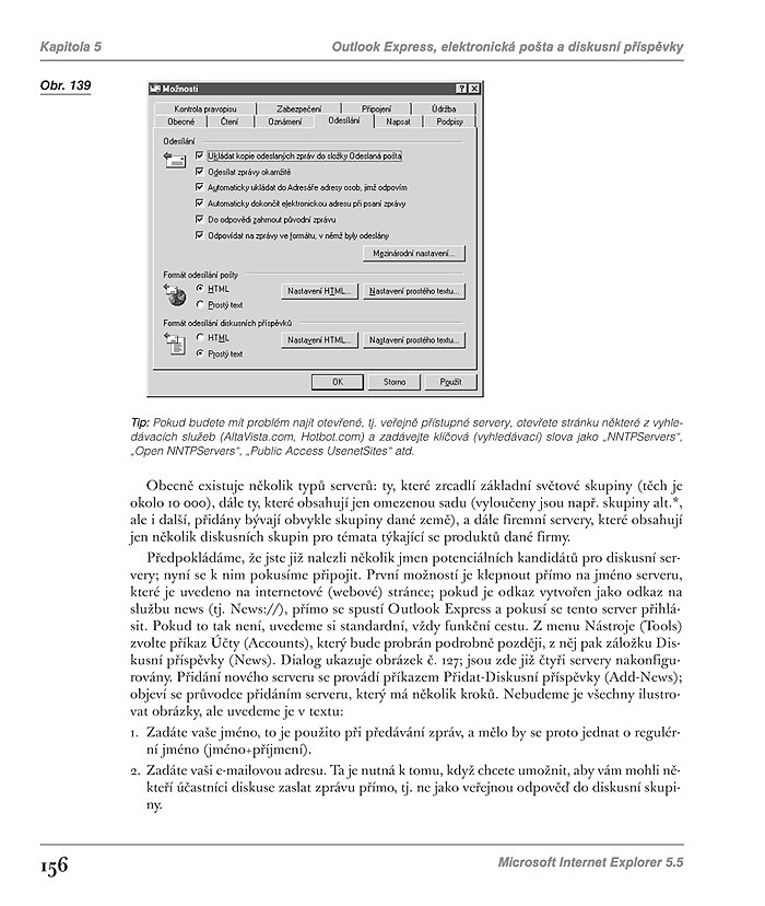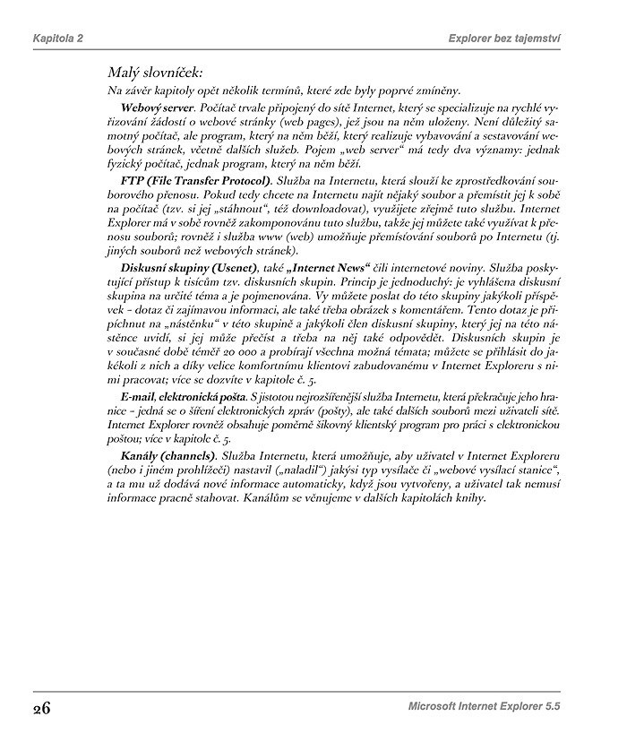 Ač vypadá na první, a možná i druhý pohled Internet Explorer 5 stejně jako předchozí dvě verze, je v něm opět dostatek nových prvků, zejména „těch uvnitř“, pro uživatele málo viditelných. Opět platí, že největší pokrok zaznamenaly doplňkové programy, jako je Outlook Express (ten je dnes standardní součástí „velkého“ Outlooku a vyniká hlavně čtečka newsgroups), rozšíření možností uživatelského přizpůsobení, lepší vyhledávání a mnohem lepší práce s historií, lepší možnosti práce offline atd. Nejnovější verze 5.5, které se věnuje naše kniha, se od páté verze liší náhledem stránky před tiskem a určitými vnitřními změnami. Příručku tedy mohou s klidným svědomím upotřebit i uživatelé verze 5.0.