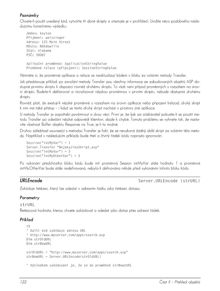 Podrobná dokumentace vlastností, metod a událostí sedmi objektů, které tvoří IIS (Application, ASPError, ObjectContext, Request, Response, Session a Server). Také je zde kapitola věnovaná souboru global.asa, předprocesním direktivám a vkládání dat na straně serveru.
