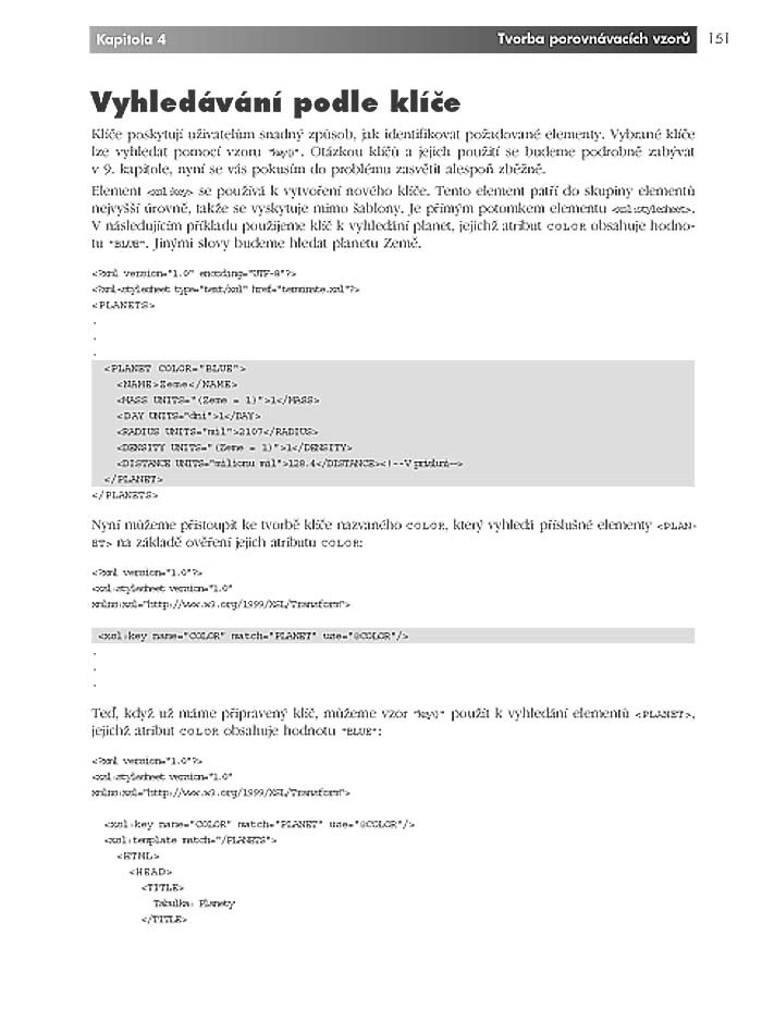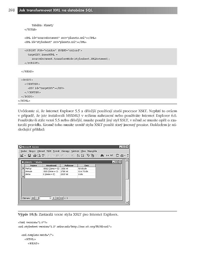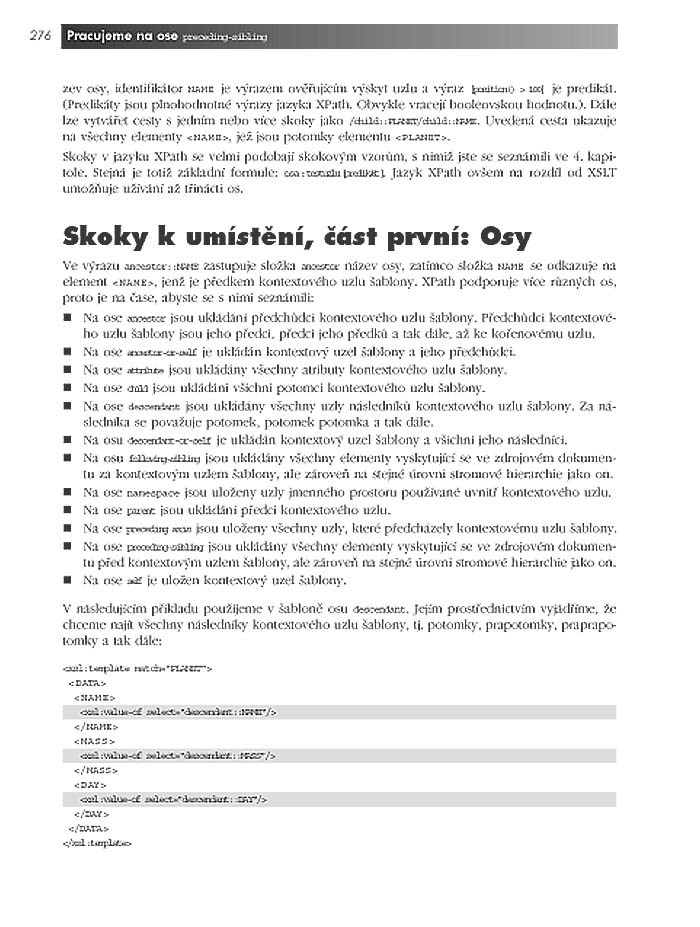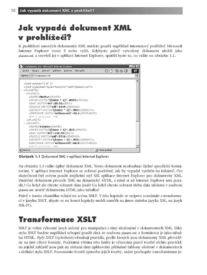Technologie XSLT umožňuje vzájemnou výměnu dat aplikací produkujících různě strukturované soubory v XML. Za pomoci procesorů XSLT provádí též transformaci XML-dokumentů do HTML, JavaScriptu, RTF, TXT, SQL či jiných formátů.Kniha počítačového guru a zkušeného autora vysvětluje všem webovým vývojářům i ostatním programátorům základy XSLT, vytváření a používání stylů XSL a šablon, porovnávacích vzorů, modifikaci obsahu dokumentů, princip a praktické využití jazyka XPath, funkce XSLT, pojmenované šablony, parametry, práci s proměnnými či s rozhraními API procesorů XSLT i formátování textů, tabulek, seznamů, obrázků, odkazů, sloupců, záhlaví a dalších obsahových prvků pomocí XSLT. Ilustrováno na množství praktických příkladů a doprovázeno CD s předními editory a procesory XSLT.