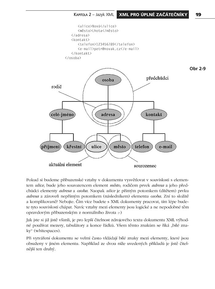 Kniha se zabývá všemi podstatnými tématy souvisejícími s technologií XML: jazyk XML, definice typu dokumentu (DTD), kaskádové styly (CSS), jazyk XPath, jmenné prostory, jazyk XSL. Zvláštní pozornost je také věnována praktickému využití XML, opakování nabytých vědomostí a dovedností formou testů, které naleznete v závěru jednotlivých kapitol.
