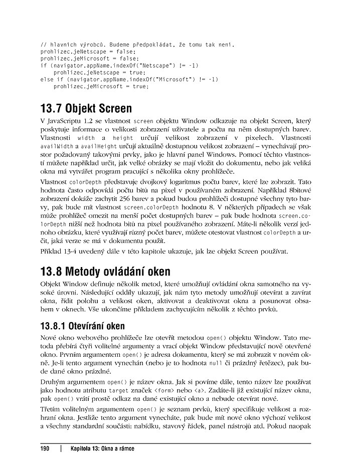 Díky plné podpoře JavaScriptu v nových verzích prohlížečů (Internet Explorer 6, Netscape 6 či Mozilla) slaví tento skriptovací jazyk své znovuzrození. Kniha proslulého nakladatelství O’Reilly je jeho „biblí“, nepostradatelnou oporou programátorů v JavaScriptu všech úrovní. Nové, aktualizované vydání naučí tvůrce stránek v HTML, jak pomocí JavaScript vytvářet dynamické webové stránky. Zkušení programátoři v něm kdykoli rychle najdou podrobné informace k programování náročných funkcí svých aplikací. Vše je dokumentováno na příkladech využití při obvyklých úlohách, jako ověřování formulářových dat, práci s cookies, vytvářením animací v DHTML apod. Referenční část obsahuje detailní popisy základního API JavaScriptu, starého API klienta a standard DOM API podle W3C. Dokumentován je každý objekt, metoda, vlastnost, konstruktor, konstanta, funkce či obsluha události JavaScriptu.