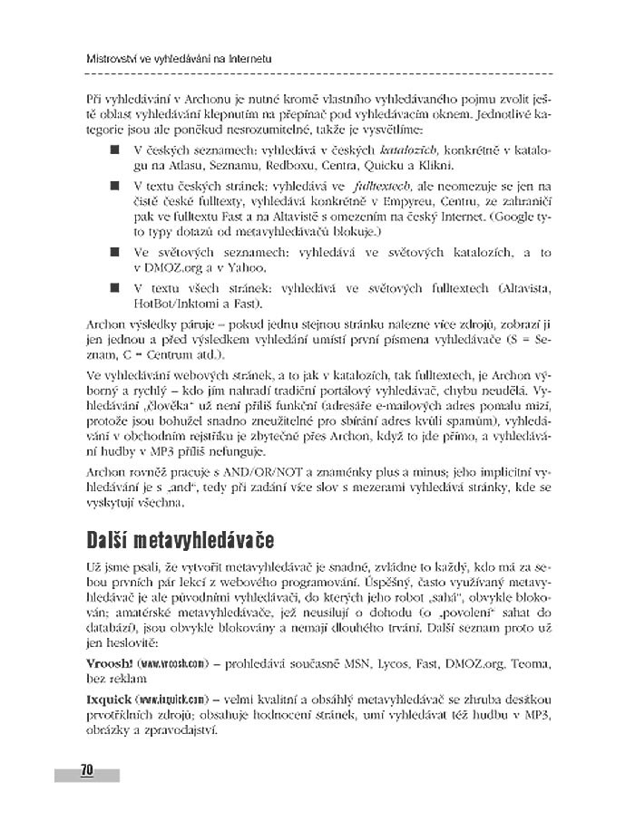 Autor v knize nabízí pomocnou ruku všem, kteří chtějí plně využívat informací na webu ukrytých a hlavně se k nim dostat rychle a efektivně. Kniha vám umožní naučit se nejen základy vyhledávání, ale i pokročilejší metody, které mnohdy vedou k cíli daleko spolehlivěji. „Umění hledat, jak hledat“, to je slovní spojení, se kterým se setkáte hned v úvodu knihy a asi nejlépe vyjadřuje její obsah. V celém textu je na tuto věc kladen velký důraz, právě z toho důvodu, že internet je velmi proměnlivým médiem a co jste našli dnes nemusí zítra existovat.