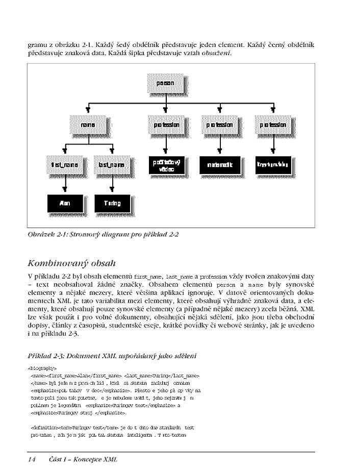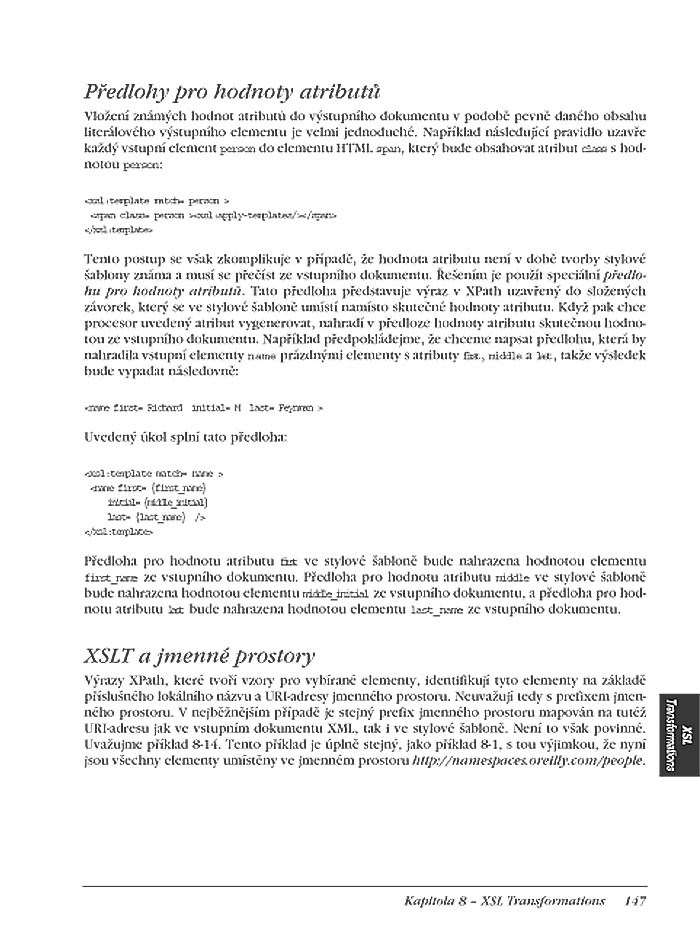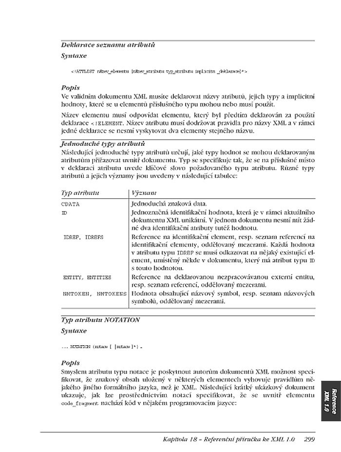 Publikace také obsahuje několik praktických referenčních kapitol, ve kterých čtenáři naleznou velmi podrobná syntaktická pravidla a ukázky použití nejdůležitějších technologií – XML, DTD, XPath, XSLT, SAX a DOM. Tato část knihy se pro vás stane nepostradatelnou ve chvíli, kdy budete potřebovat velmi rychle vyhledat přesnou syntaxi čehokoli, o čem víte, že to lze v jazyce XML vytvořit, ale zrovna si nepamatujete, jak na to. Další neopominutelnou výhodou této knihy je množství příkladů, výpisů a skriptů, které vás detailně provedou celou problematikou XML a názorně doplní velmi srozumitelně a přitažlivě psané teoretické pasáže.