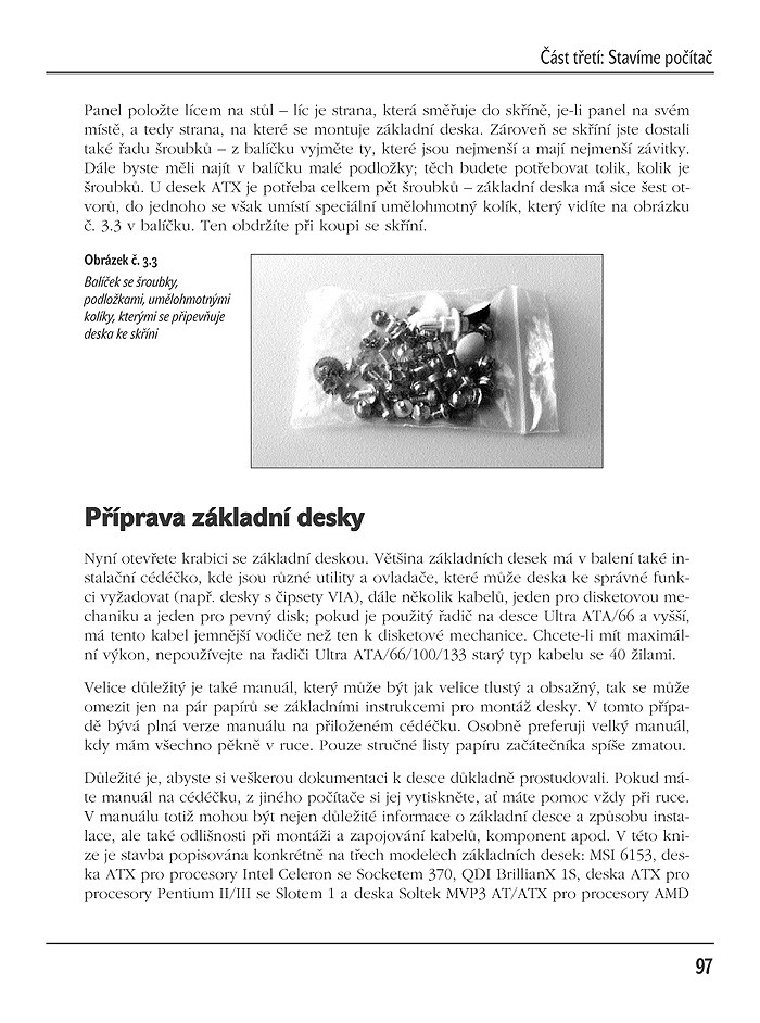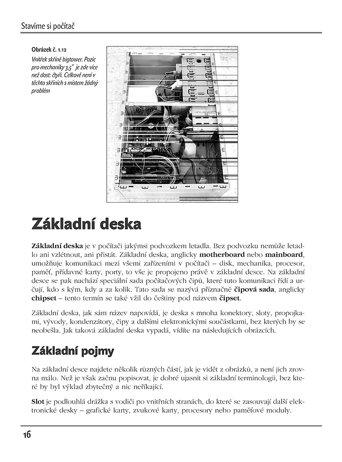 První kapitola popisuje všechny části počítače, vysvětluje k čemu slouží a jaké typy daných komponent existují. Publikace pokračuje výběrem komponent vhodných pro běžné typy počítačů (pro kancelář, na hry a domácí využití, účetnictví, grafiku a DTP) – poskytne vám i přehled všech důležitých prvků (základní desky, procesory, grafické karty, paměti apod.), které byly v době psaní knihy na trhu.