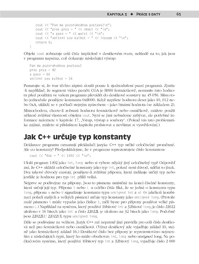Na světě bylo pro výuku programovacího jazyka C++ napsáno několik tisíc publikací, avšak jen několik z nich dosáhlo takové proslulosti, aby vešly ve známost jako spolehlivé učebnice pro zvládnutí všech složitostí programování v tomto jazyce. Kniha Stephena Praty vydaná u amerického nakladatelství Sams Publishing patří bezesporu mezi ně. Pro až průzračně srozumitelný výklad, jímž prolínají stovky skvěle zvolených příkladů, názorné vysvětlující diagramy, které takříkajíc otevírají oči, a důmyslná programátorská cvičení sklidila úspěch i v prvním českém vydání z r. 2001. Čtenáři na ní vždy oceňují, že vysvětlování i experimentování s třídami, polymorfismem, dědičností a dalšími tradičními prubířskými kameny objektově orientovaného programování je po celou četbu poutavé a pochopitelné i pro ty, kdo se teprve začínají považovat za programátory.