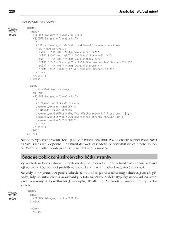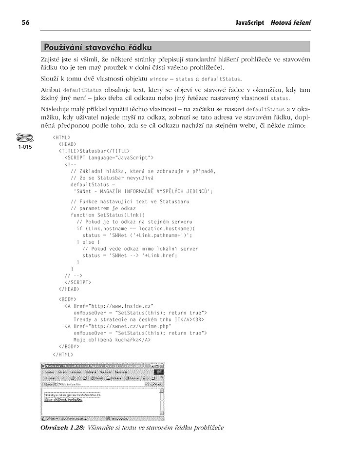 Ryze praktická knížka přináší základní vysvětlení možností JavaScriptu, především však víc než stovku nejpotřebnějších či zajímavých skriptů a konkrétních návodů na řešení obvyklých problémů a dosažení zajímavých efektům. Mj. formuláře, rámce, zpracování data a času, cookies, detekce a ovládání prohlížeče, dynamické efekty ad.
