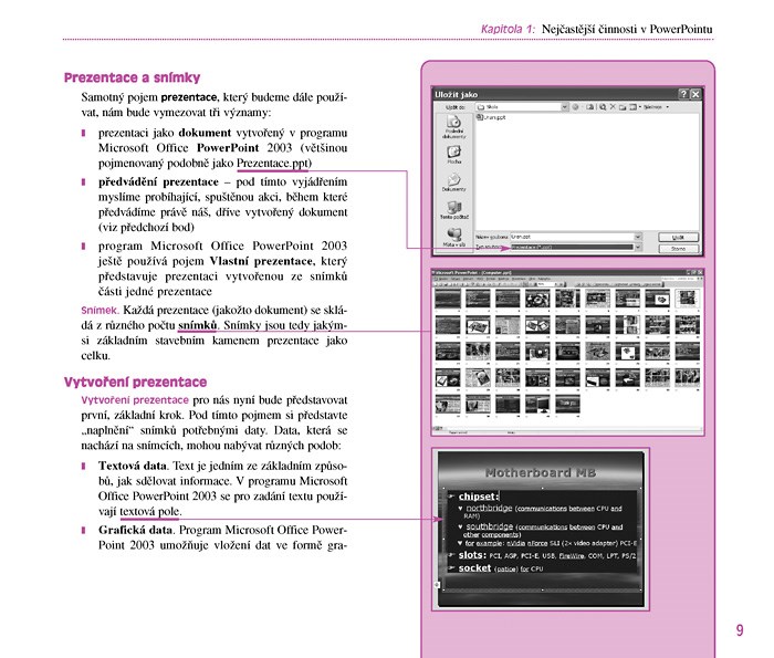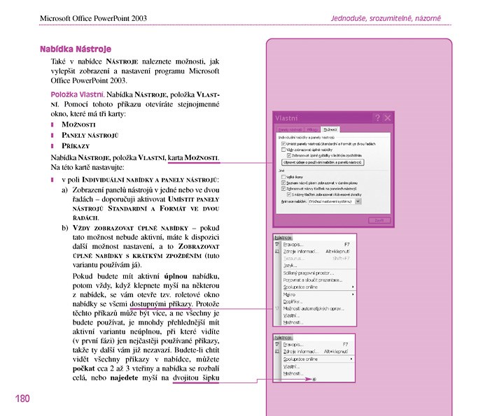 V této příručce se naučíte vše podstatné, co budete k ovládání a efektivnímu využití PowerPointu 2003 potřebovat: vytvořit prezentaci, pracovat se snímky, vkládat grafické objekty, tabulky, grafy a diagramy, videa a další prvky. Dále se naučíte nastavit prezentaci pro předvádění, řídit její projekci, ale i vytisknout podklady pro prezentaci na papír.