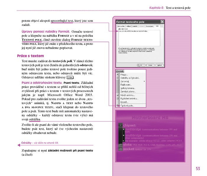 Činnosti jsou krok po kroku ilustrovány obrázky sejmutými z příslušných oken programu na obrazovce počítače a na ilustracích je vždy zvýrazněno, „vytaženo“ pro oko čtenáře to, čeho se probíraná činnost týká. Dotyčné elementy v obrázku jsou s místem popisu v textu pro snadnou orientaci propojeny čarami.