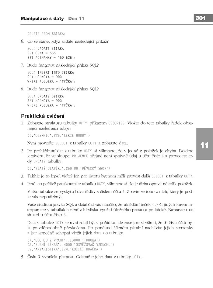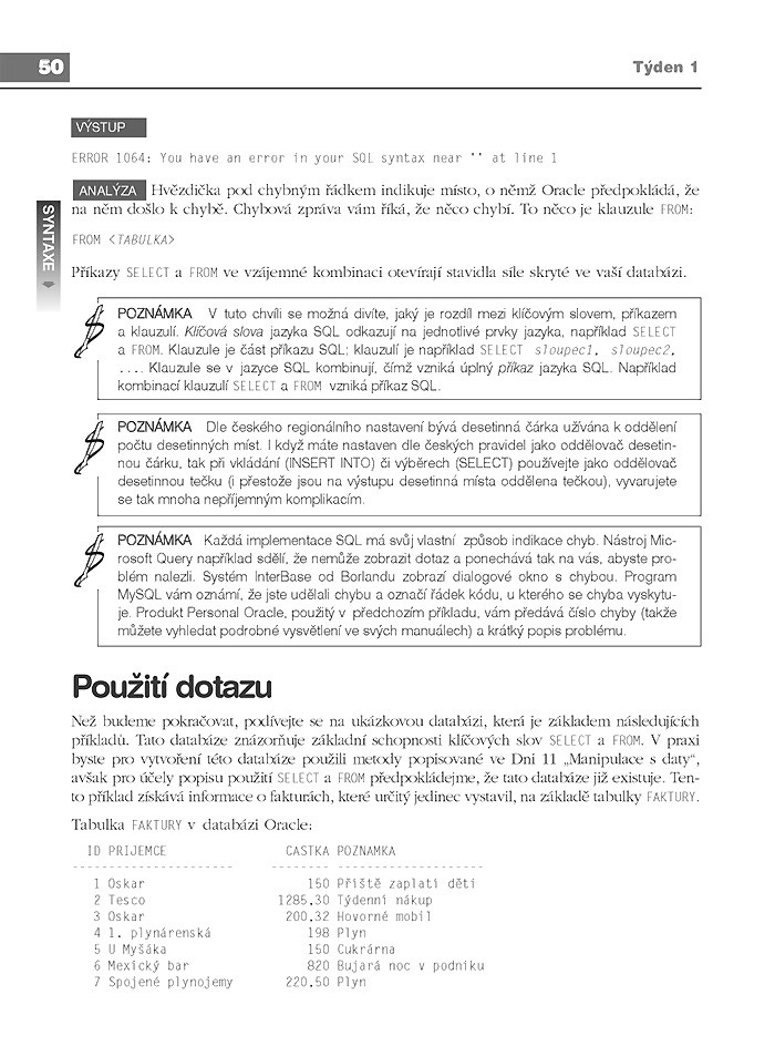 Kniha Naučte se SQL za 21 dní přináší všem zájemcům o oblast relačních databází solidní vysvětlení principů a mnohostranného použití jazyka SQL (Structured Query Language), jenž je „pohonem“ většiny všeobecně rozšířených databázových systémů, jimiž jsou např. MySQL, Oracle, SQL Server, IBM DB2, InterBase, Access a mnohé další. Tato kniha je překladem již čtvrtého, opět aktualizovaného vydání knihy Sams Teach Yourself SQL in 21 Days. Časové určení „za 21 dní“ v názvu není v žádném případě bezobsažným sloganem: kniha je skutečně rozdělená do 21 lekcí přiměřené délky, z nichž v každé proberete jedno ucelené téma od celkového vysvětlení do slušné hloubky a podrobnosti. Abyste se přesvědčili, nakolik jste další kus látky zvládli, obsahuje v závěru každá lekce kontrolní otázky i praktická cvičení, jejichž řešení najdete v příloze knihy. Zvládnete především tyto oblasti práce s databázemi:
