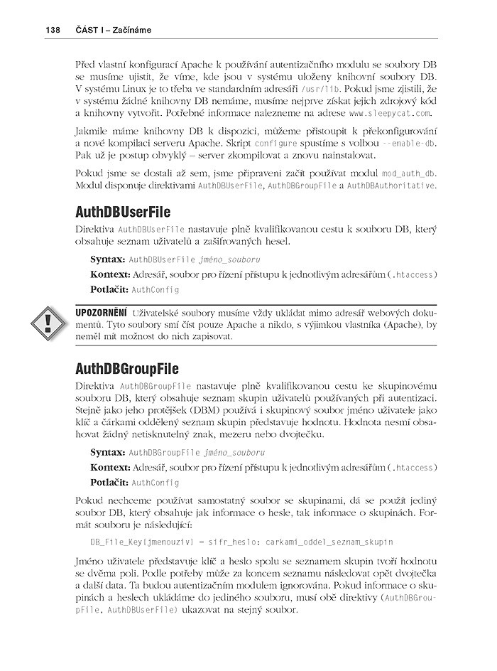 Pro zvládnutí a plné obsáhnutí tohoto systému, publikacemi v češtině dosud spíše jen „nakousnutému“, jsme pro vás vybrali knihu z nejpodrobnějších a nejuznávanějších: Apache Server 2 Bible, která bývá ve světě charakterizována hodnoceními „Více než jen kniha o Apache“ nebo „Kniha, kterou musíte mít, jste-li na Apache odkázáni“. Provede vás všemi klíčovými oblastmi při používání tohoto WWW serveru z hlediska jeho administrace, ale i návazného programování, nastavení a zabezpečení webových aplikací. Programátoři v Perlu a PHP zde najdou potřebné postupy pro programování webových aplikací i s využitím databáze MySQL.