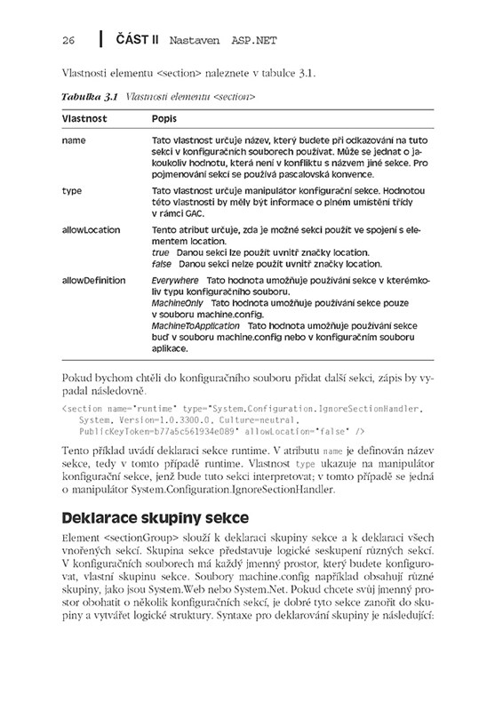 Jádrem knihy jsou přehledy sekcí a jejich elementů s vysvětleními a příklady hodnot, které jim lze v konfiguračních souborech ASP.NET přiřadit. Syntaxe a přehledné tabulky se vhodně střídají s ukázkami praktického využití nastavení v aplikacích (v C# i VB.NET), doplněnými tipy a dalšími užitečnými informacemi. Nastavení prováděná v dialogových oknech jsou názorně dokumentovány snímky obrazovek, popř. krokovými instrukcemi. Slovníček pojmů vám usnadní orientaci v českých pojmech používaných ve vazbě na anglické názvy elementů konfiguračních souborů.