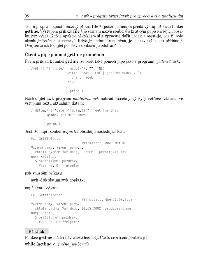 Další neméně významnou částí je kapitola věnovaná editoru sed. Použití editoru sed není tak jednoduché jako jiných – interaktivních editorů. Sed načítá příkazy pouze ze souboru nebo příkazového řádku. Naučíte se využívat těchto možností a využijete je jako výhody, kterými vyčnívá mezi ostatními editory v linuxu. Na názorných příkladech jsou předvedeny široké možnosti využití při dávkové editaci dat s pomocí skriptů v jazycích C nebo Perl.
