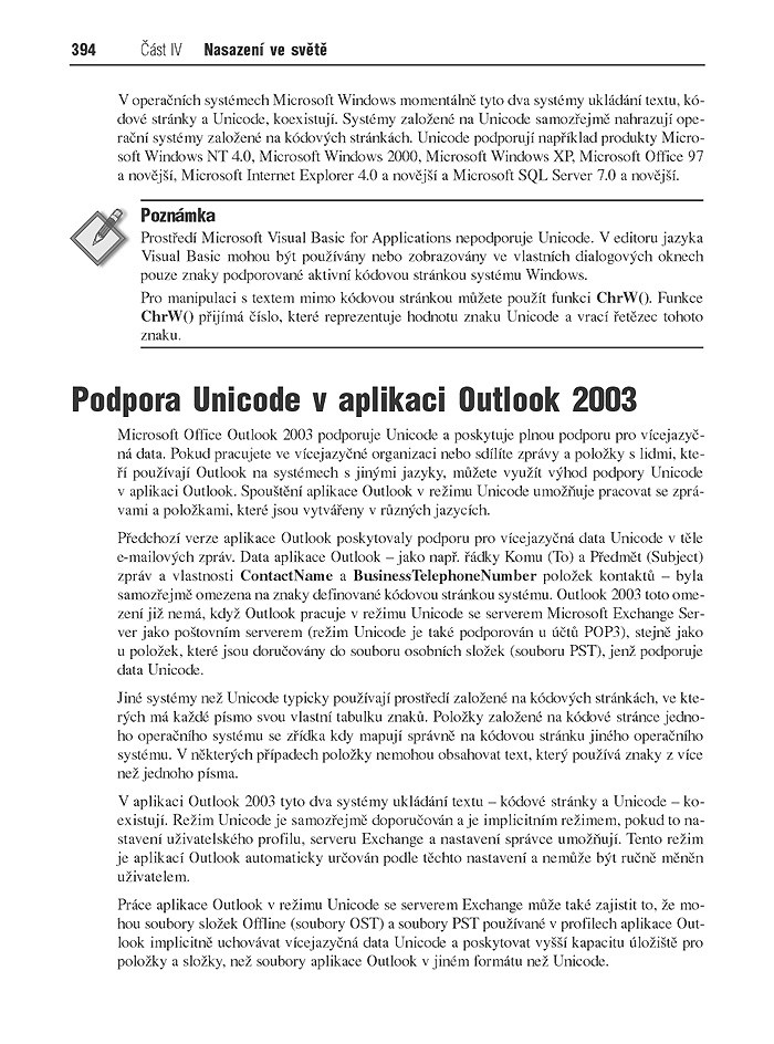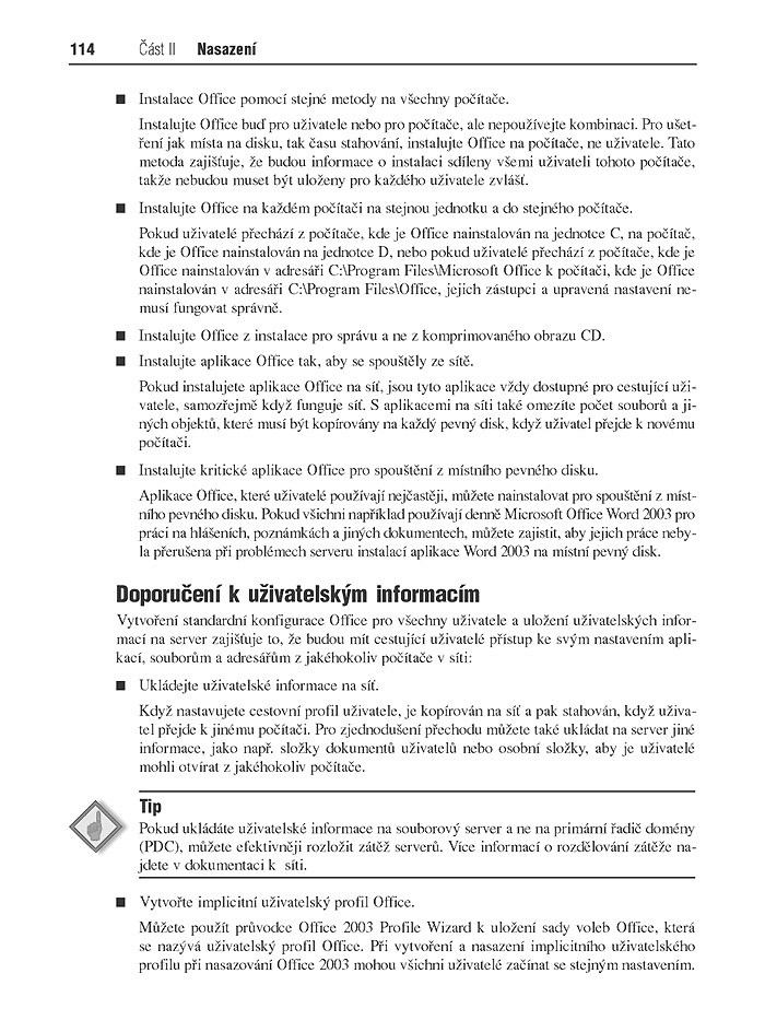 Oficiální balík dokumentace a softwarových nástrojů "Microsoft Office 2003 Resource Kit" od specialistů Microsoft Office product-teamu je určen pro firmy všech velikostí od malých až po globální. Plánování a implementace programů MS Office, údržba a zabezpečení toku informací ve firmě se neobejdou bez hlubokých znalostí a dokumentace uspořádané tak aby bylo možno rychle nalézt potřebné údaje pro podporu produktivity celé společnosti. Dejte si poradit od povolaných odborníků Microsoft Office teamu, jak: přizpůsobit instalaci MS Office, uživatelská nastavení pomocí nástrojů na CD, nasadit MS Office užitím skupinových zásad nebo Microsoft Systems Management Serveru, připravit a provést upgrade programu Outlook 2003, konfigurovat předvolby pro zabezpečení proti virům, nevyžádané poště, virům a jiným útokům, využít technologie Microsoft Windows SharePoint Services a Web Access k usnadnění spolupráce mezi jednotlivými pracovišti, zjednodušit nasazení ve vícejazyčném prostředí pomocí Multilingual User Interface (MUI) Pack, udržovat provoz MS Office, porozumět chybovým hlášením, detekovat a opravovat chyby a aktualizovat celou sadu programů MS Office, implementovat programy Microsoft Office OneNote 2003 a Microsoft Office InfoPath 2003.
