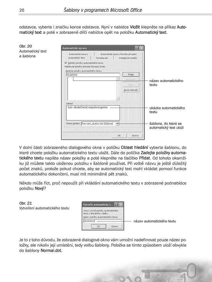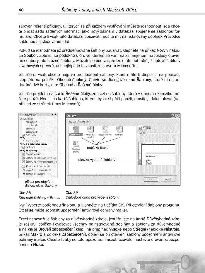 S touto příručkou se například naučíte vytvářet a s výhodou používat ve Wordu šablony nejrůznějších textových dokumentů a formulářů (např. žádostí), v Excelu šablony založené na tabulkách či grafech (např. ekonomické a účetní dokumenty jako faktury, kalkulace, výkazy činnosti, apod.) v prezentačním programu PowerPoint vlastní prezentace, pohlednice, diplomy či přání, a možná budete při probírání šablon překvapeni, co lze také elegantně vytvářet v Outlooku.