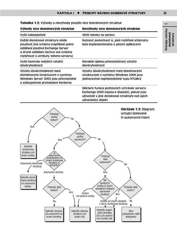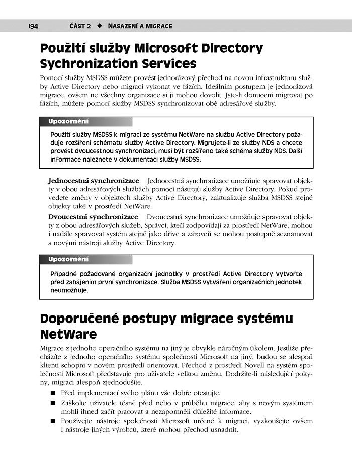 Diskutuje také typy a metodologie ruční a automatické instalace. Kapitola o migraci a konsolidaci domén se zabývá problémy, kterým budete čelit při přechodu z infrastruktury systému Windows NT na službu Active Directory a ze systému Windows 2000 na Windows Server 2003. Kapitola o migraci systému NetWare poradí, na co si dát pozor při přechodu z tohoto „jiného operačního systému“ na infrastrukturu služby Active Directory.