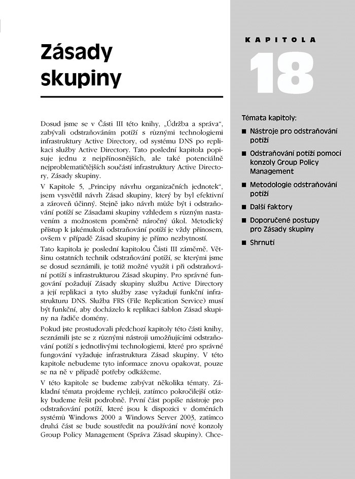 Tato kniha představuje zajímavé odbočení od obvyklých příruček. Po úvodním představení systémů Windows 2000, Windows Server 2003 a služby Active Directory se nevěnuje pouze vysvětlování principů práce, ale soustředí se na seznámení čtenáře s postupy, jež byly dlouhodobými zkušenostmi potvrzeny jako optimální, tj. které při dodržování zaručí nejmenší celkovou pracnost a nabídnou nejrychlejší způsoby přijímání změn. Je určena pro čtenáře spíše mírně pokročilé, až na střední a pokročilé úrovni, kteří již mají základní znalosti v probírané problematice. S ohledem na tento předpoklad je rozdělena na čtyři části: