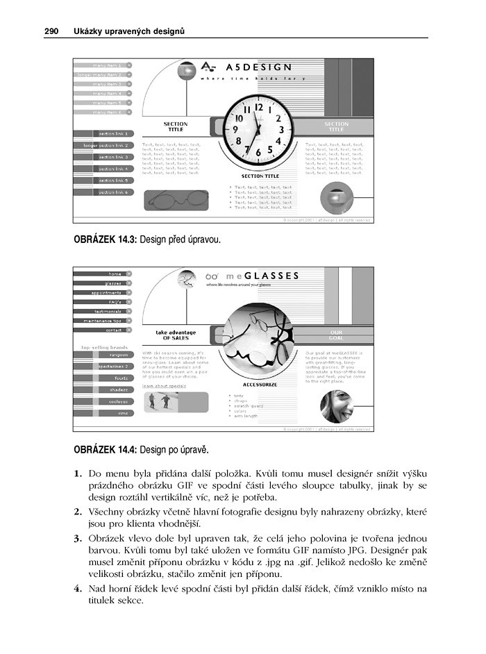 Jednotlivé přístupy jsou ilustrovány 50 modelovými weby, jejichž zdrojové soubory naleznete k volnému použití na CD. Z knihy tak můžete čerpat nejen poučení a zdokonalení v tvůrčích technikách, ale i vydatnou inspiraci nebo přímé použití z hotových řešení od webových profesionálů.
