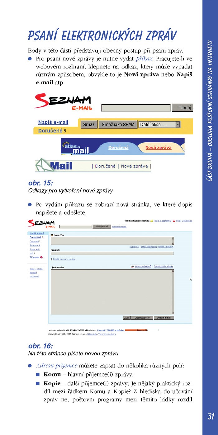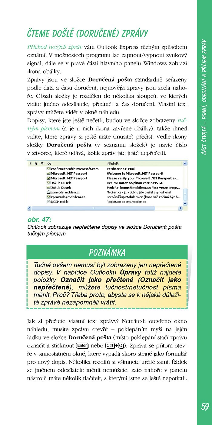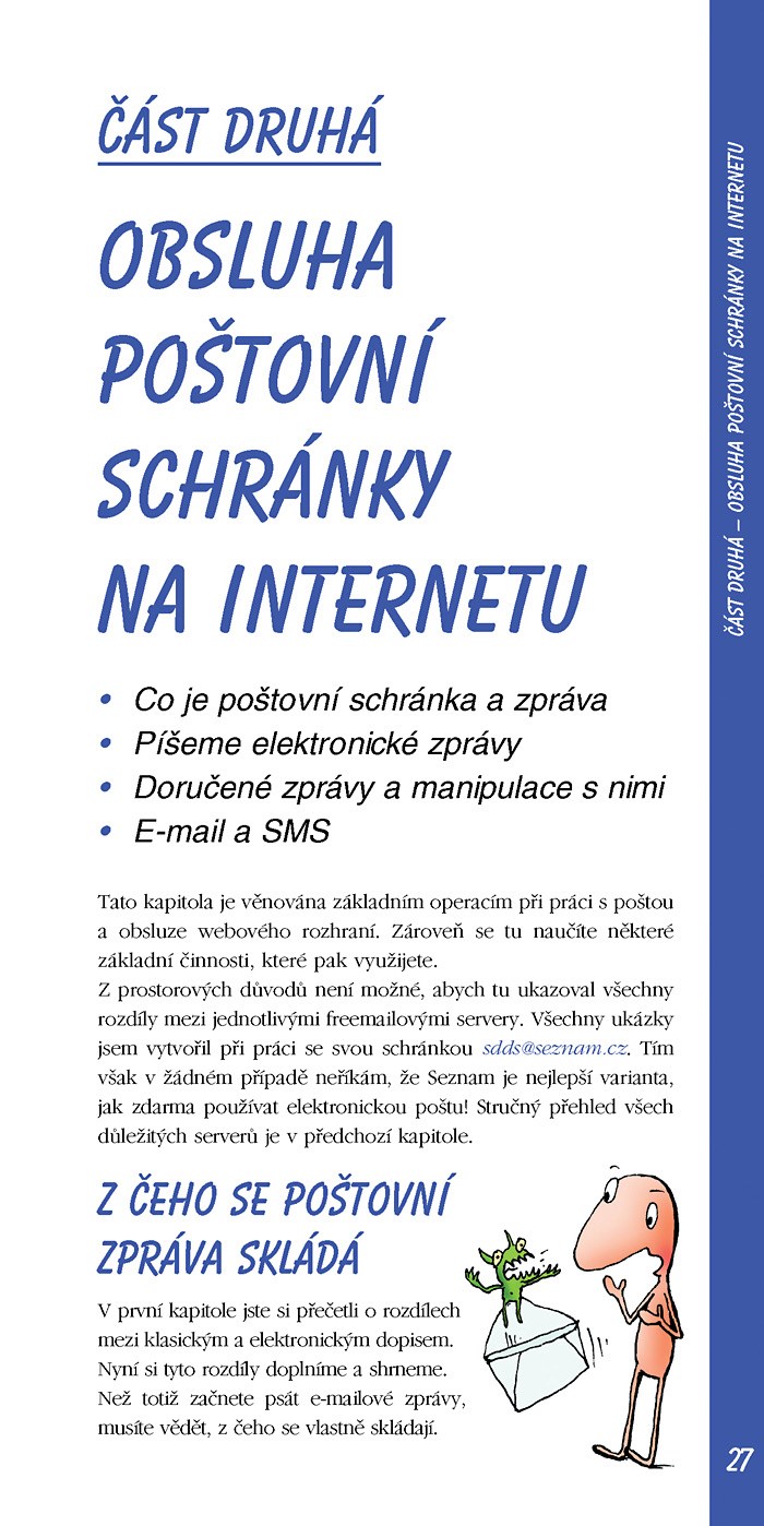 Elektronická pošta je nejpoužívanější součástí Internetu vůbec. Tato příručka vám pomůže s připojením k Internetu a nakonfigurováním vašeho Outlook Express, i se zřízením e-mailovou schránky a s výběrem mezi freemailovými servery u nás. S autorovou pomocí dokážete psát, odesílat, přijímat, vyhledávat a řadit e-maily, posílat soubory jako přílohy, automaticky třídit došlé zprávy do zvláštních složek, vyznat se v adresáři, pravidelně a správně zálohovat … rychle a pohodlně z tepla domova!