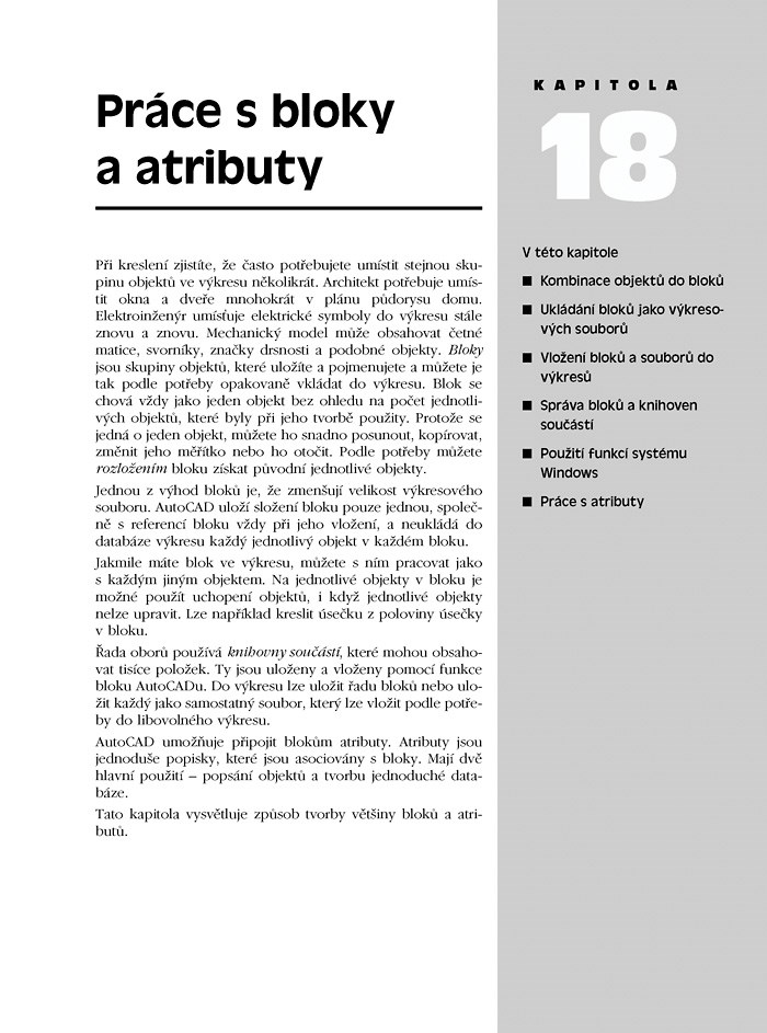 Chcete poznat víc, než jenom kreslení? Chcete se stát opravdovými mistry, naučit se využívat přístup AutoCADu k databázím, 3D modelování a nahlédnout i do programování? Kniha Mistrovství v AutoCADu je uspořádána tak, abyste mohli nahlížet, kdykoliv to bude potřeba v průběhu každodenní práce, nebo když se rozhodnete poprvé provést něco, co jste ještě nezkoušeli. Je tedy určena uživatelům AutoCADu všech stupňů pokročilosti, začátečník se naučí jednoduché postupy jako tvorba základních entit, pokročilý uživatel najde informace o pokročilejších technikách jako je 3D modelování a spolupráce s databázemi. Každá kapitola pokrývá kompletně jedno téma a usnadňuje hledání požadovaných informací. Obsahuje postupy, které lze provést samostatně bez nutnosti provedení jiných cvičení v kapitole. Současně ale lze snadno vyhledat potřebné téma a provést související cvičení bez toho, že byste museli procházet celou kapitolu. K hledání témat vám rovněž může pomoci kompletní rejstřík pojmů na konci knihy. Kniha byla původně napsána pro verzi 2004, ale obsahuje kapitoly o nových funkcích verzí 2005 a 2006.
