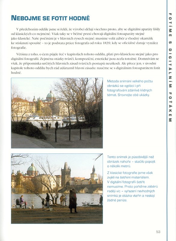 Každému srozumitelné, názorné vyprávění namísto „vědy“, to je hlavní tajemství této knihy. Je určena širokému okruhu zájemců o digitální fotografii. Pomůže lidem, kteří se teprve rozhodují, zda si mají digitální fotoaparát koupit a pokud ano, pak jaký. Nabízí klíč k pochopení smyslu digitální fotografie, výhod a nevýhod jednotlivých kategorií fotoaparátů a jejich vhodnost nebo nevhodnost pro konkrétní druh použití. Užitek z ní budou mít i lidé, kteří digitální fotoaparát už vlastní. Plná polovina knihy, doprovázená barevnými ukázkami, je věnovaná práci v terénu s přihlédnutím ke zvláštnostem práce s digitální aparátem, a také následnému zpracování digitálních snímků na počítači. Autor tu prozrazuje tajemství a tajemstvíčka z praxe: jak fotit krajinu, reportáž, portrét a třebas i broučky v trávě, jak si poradit při špatných světelných podmínkách, jak fotit na sněhu a jak v interiéru. V části věnované zpracování na počítači ukazuje na možnosti, jež digitální zpracování nabízí, a zaměřuje se na základní funkce, které mají všechny programy určené ke zpracování digitálních snímků. Výklad nevyžaduje žádné předběžné technické znalosti a odborné termíny jsou zde srozumitelně vysvětleny na příkladech, a když je nutno, v obrazovém znázornění.
