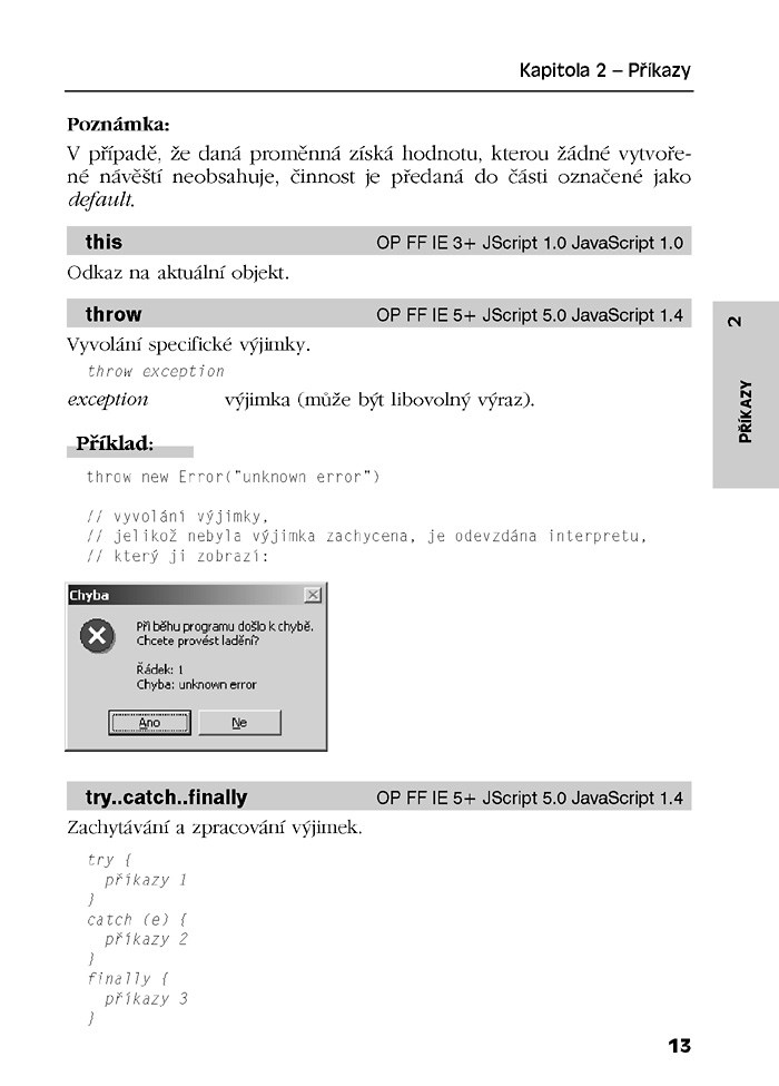 Tento knižní kapesní přehled podá pomocnou ruku každému, kdo ovládá alespoň základní principy JavaScriptu, kdo si však nepamatuje přesnou syntaxi potřebných příkazů, myslí na správnou funkčnost skriptů v různých prohlížečích či kdo stojí o poznání bohaté funkční výbavy tohoto populárního jazyka. Použitelnost knížky zvyšuje praktická kroužková vazba, přehledné členění v tématických kapitolách a kompletní rejstřík všech obsažených klíčových slov.