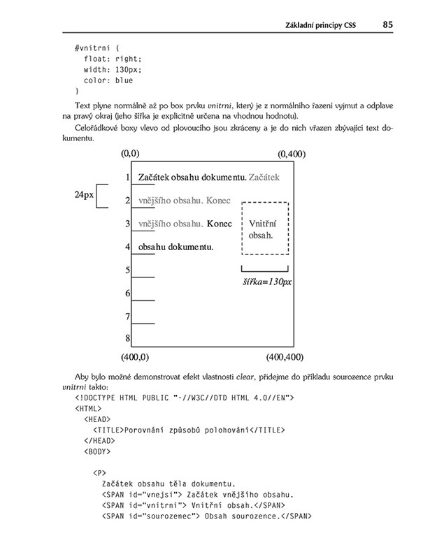 Tato kniha se zabývá všemi oblasti CSS – od nezbytného úvodního popisu, co to vlastně CSS je a k čemu může a nemusí být dobré, se přehoupnete do základních principů CSS, které by měl znát každý zájemce o CSS a nakonec skončíte u velmi podrobných popisů jednotlivých vlastností stylů, kde nechybí praktické ukázky a jejich vysvětlení.