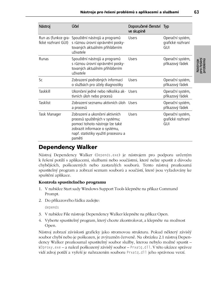 - Získání a použití obvyklých i méně známých nástrojů pro řešení problémů v systémech Windows: např. Event Viewer (Prohlížeč událostí), Task Manager (Správce úloh), Device Manager (Správce zařízení), Performance Logs and Alerts (Výstrahy a protokolování výkonu), System Configuration Utility, Disk Defragmenter (Defragmentace disků), Recovery Console (Konzola pro zotavení), Network Monitor (Sledování sítě), Program Compatibility Wizard, Computer Management, Dependency Walker, Eventtriggers, Openfiles, Gpresult, Sc, Boot Logging, Driver Verify Manager, Memory Pool Monitor, Shutdown Event Tracker, Chkdsk, Disk Cleanup, DiskPart, DiskProbe, Arp, Ipconfig, Nbtstat, Netdiag, Nslookup, Pathping, Portqry a dalších