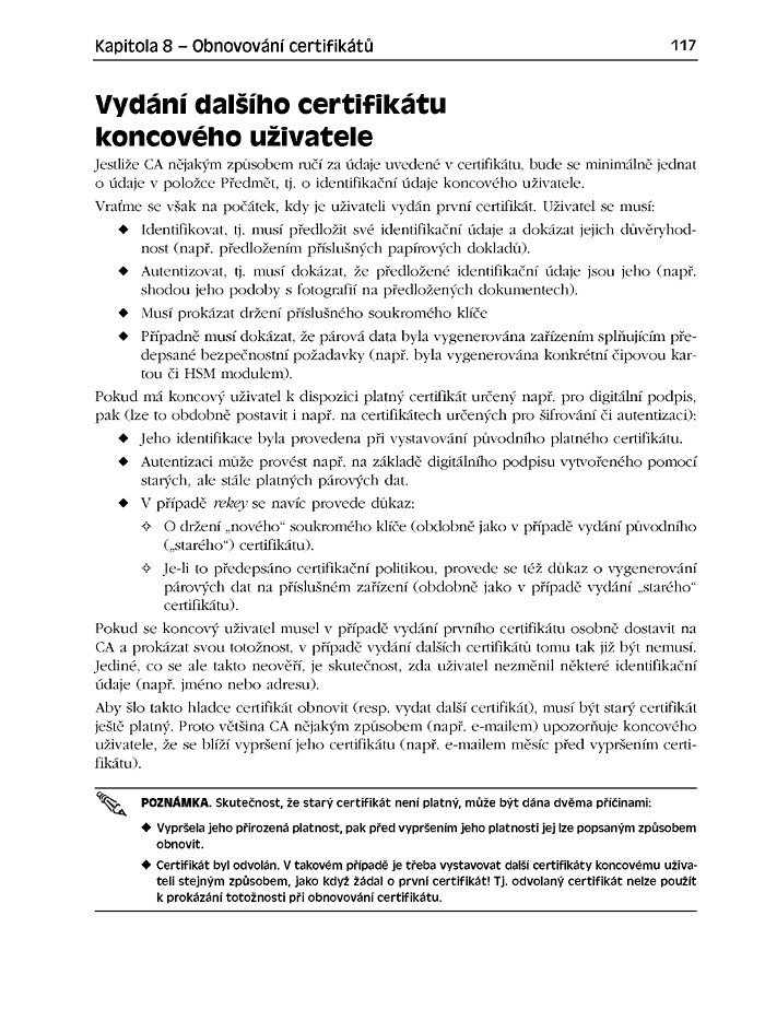 Zavedení komunikace pomocí elektronického podpisu v organizaci zpravidla vyžaduje vybudování infrastruktury veřejných klíčů (PKI). Jejím základem je certifikační autorita, která vydává a spravuje certifikáty. Vybudování této infrastruktury a její začlenění do používaných aplikací nemusíte draze outsourcovat: při využití certifikační služby, jež je součástí Microsoft Windows Serveru 2003, s pochopením technologického pozadí a praktickými kroky, které ukazuje tato kniha, můžete navrhnout a implementovat odpovídající řešení sami.