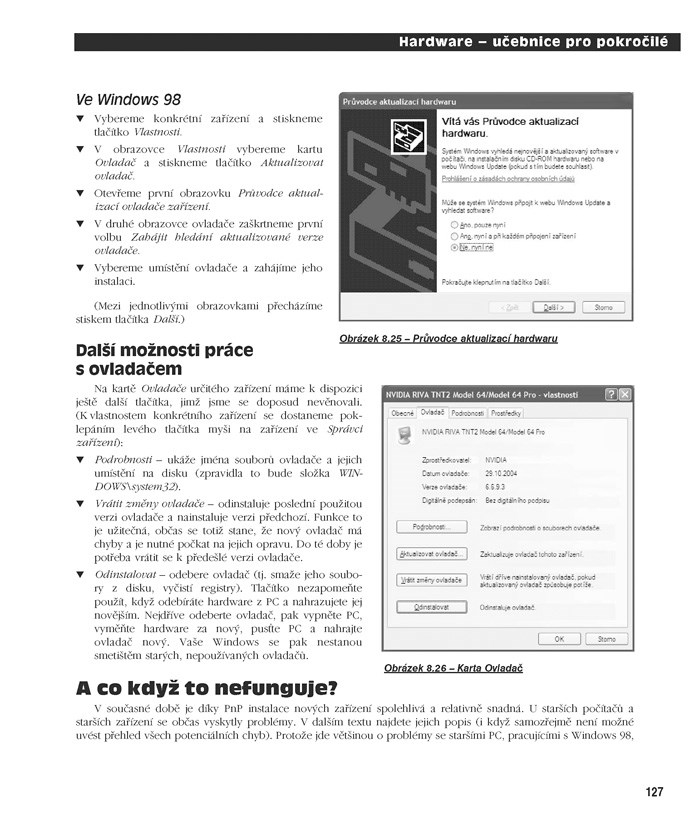 V následující části knihy Způsoby práce s pevnými disky přibyl výklad o údržbě a konfiguraci NTFS. Další kapitoly ukazují práci s přenosnými médii, disky CD, CD–R, CD–RW a DVD. Nově se objevuje kapitola Zvuková karta a také v kapitole Zobrazovací soustava je vysvětleno mnoho nových pojmů. Jde o samotné grafické karty, monitory a LCD panely. Modemy jsou dnes běžně používány k internetovému připojení, jejich popis byl opět doplněn o práci ve Windows XP. Poslední kapitoly spíše doplňují hardwarovou problematiku. Setup shrnuje zásady práce s pro-gramem Setup, závěrečná část knihy vysvětluje některé vlastnosti Windows XP. Najdete zde informace o startu Windows, zálohování souborů, práci s registry atd.