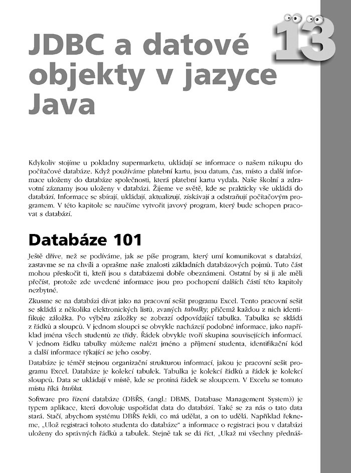 Začnete od toho, jak funguje počítačový program, a poznáte, jak snadno se píší instrukce v Javě. Dále se ponoříte hlouběji do základů jazyka, pochopíte význam datových typů a proměnných, naučíte se používat příkazy, metody, třídy. Budete umět ve svých programech ošetřovat chyby, komunikovat s databázemi (JDBC). Konečně pochopíte i základní principy objektového programování, jako je dědičnost.
