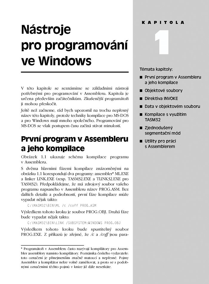 Autorovi se podařilo zrevidovat a zdokonalit dostupné materiály o programování v jazyce Assembler pro Windows. Problematiku vysvětluje krok za krokem, od základních principů a nástrojů až po sofistikované techniky a metody, které lze označit za reverzní inženýrství. Zájemce z řad profesionálních programátorů, studentů i nadšenců po novém rozměru programování vpraví do hloubky problematiky Assembleru a připraví je na řešení i složitých úloh nejrůznějšího typu, včetně tvorby dynamických knihoven, služeb, ovladačů zařízení, systémového a síťového programování či zpracování souborů.