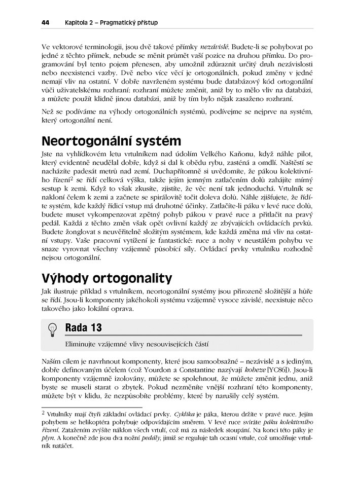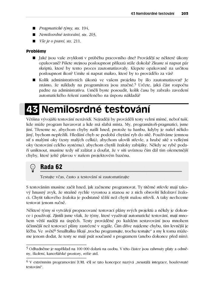 Dnes již klasická kniha světové počítačové literatury pomáhá programátorům vyrovnat se s rostoucími nároky jejich profese. Autoři s neobvyklou názorností ukazují, že zcela všechny tradiční problémy vývoje softwaru (vznik chyb a jejich odhalování, efektivní editace, nejasná zadání, změny v projektech, odhady termínů, hledání algoritmů úloh, udržování přehlednosti kódu a celého projektu, týmová spolupráce aj.) mají svá ryze pragmatická řešení – například v přísné modularizaci kódu, plně systematickém přístupu, ve všestranné automatizaci práce, nedílném testování, kritickém a realistickém myšlení, osvojování novinek… Dávají k tomu konkrétní rady, jimiž se může řídit každý programátor, užitečné nástroje a srozumitelné příklady.