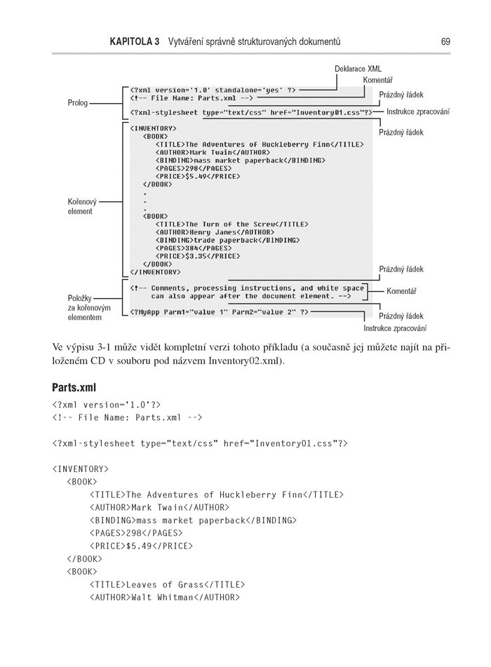 - Využití komentářů, instrukcí zpracování a vkládání sekcí CDATA