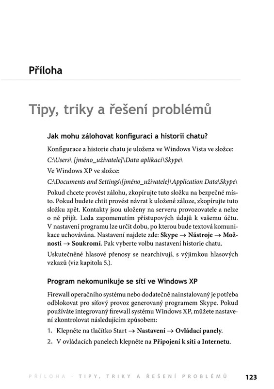 Knihu doplňuje příloha, v níž najdete řadu tipů, triků a především řešení problémů se Skypem a jeho připojením k Internetu.