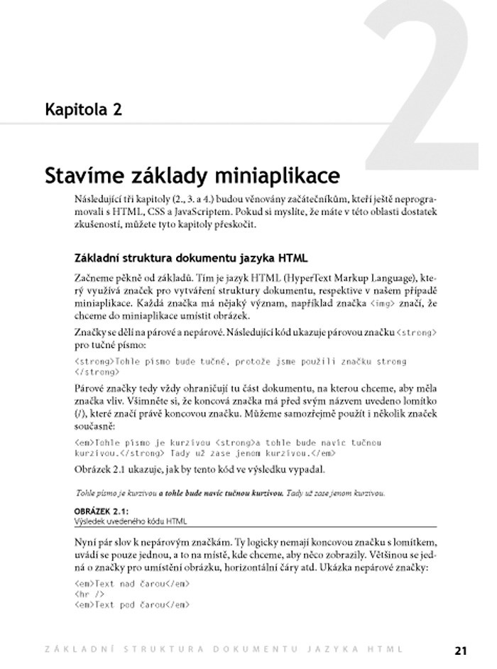 Publikace nevyžaduje žádné znalosti HTML, CSS nebo JavaScriptu a výuka probíhá od úplných základů, krok za krokem a důsledně na praktických cvičeních. Postupně tak projdete všemi fázemi vývoje miniaplikace – od základního vzhledu až po naprogramování funkcí a ovládání. To vše doplňují tipy a postřehy z praxe, díky nimž bude práce efektivnější a snadnější.