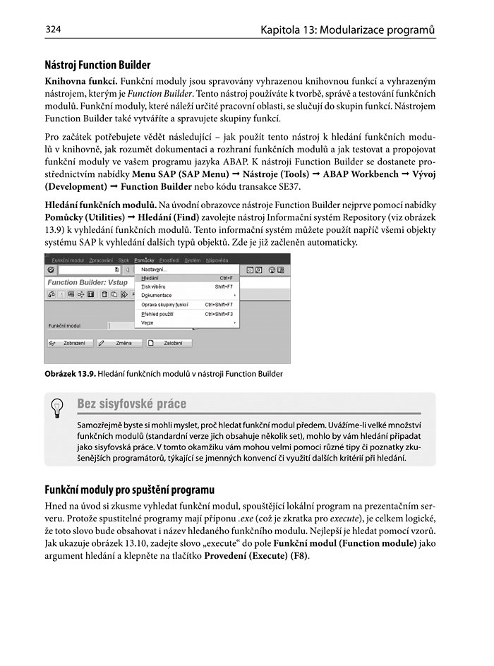 Výklad začíná zcela od základu, od instalace vývojových nástrojů a seznámení s jazykem ABAP. Pokračuje krok za krokem přes všechny oblasti vývoje (práce s databázemi, řídicí struktury) až po komplikovanější činnosti jako využití interních tabulek a modularizace programu.