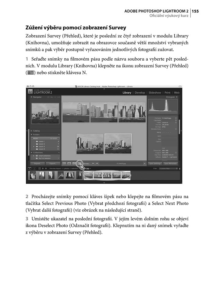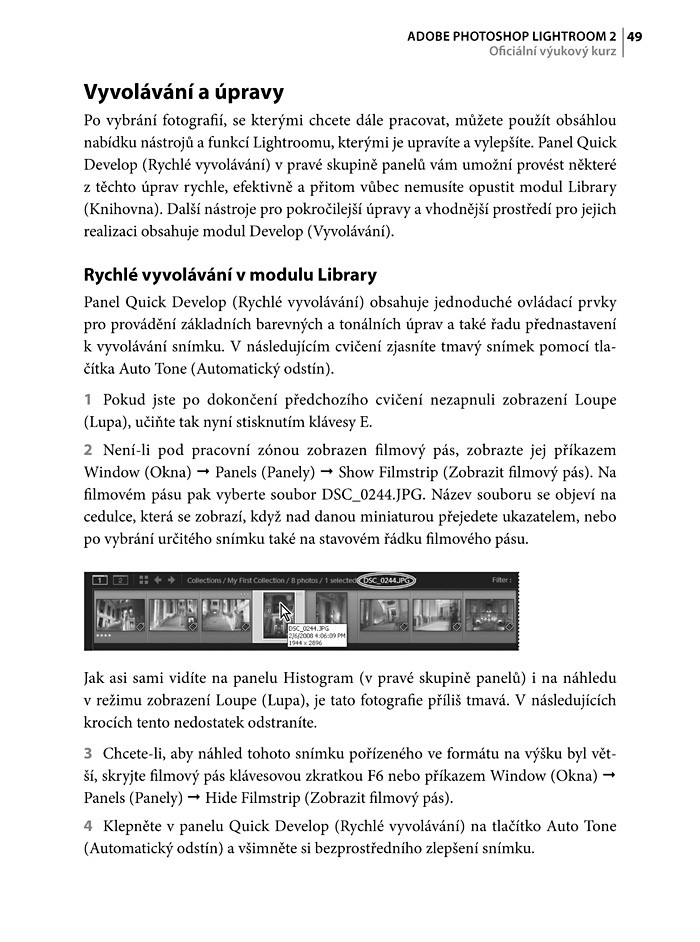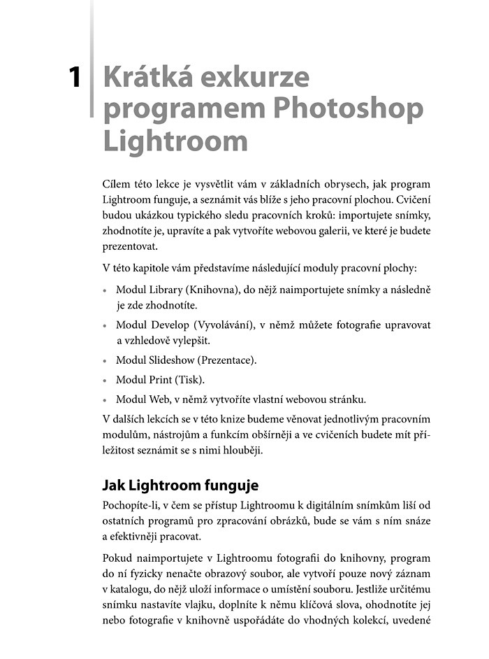 Oficiální výukový kurz je výukovou příručkou od samotných tvůrců tohoto programu. V 10 lekcích se sami krok za krokem naučíte vše od ovládání a základů práce v Lightroomu 2 až po náročnější postupy a praktické využití nejnovějších funkcí. V jednotlivých lekcích budete krok za krokem procházet reálným postupem práce s fotografiemi od stažení do počítače až k finálnímu exportu snímků, díky čemuž své vědomosti a znalosti postupně zdokonalíte.