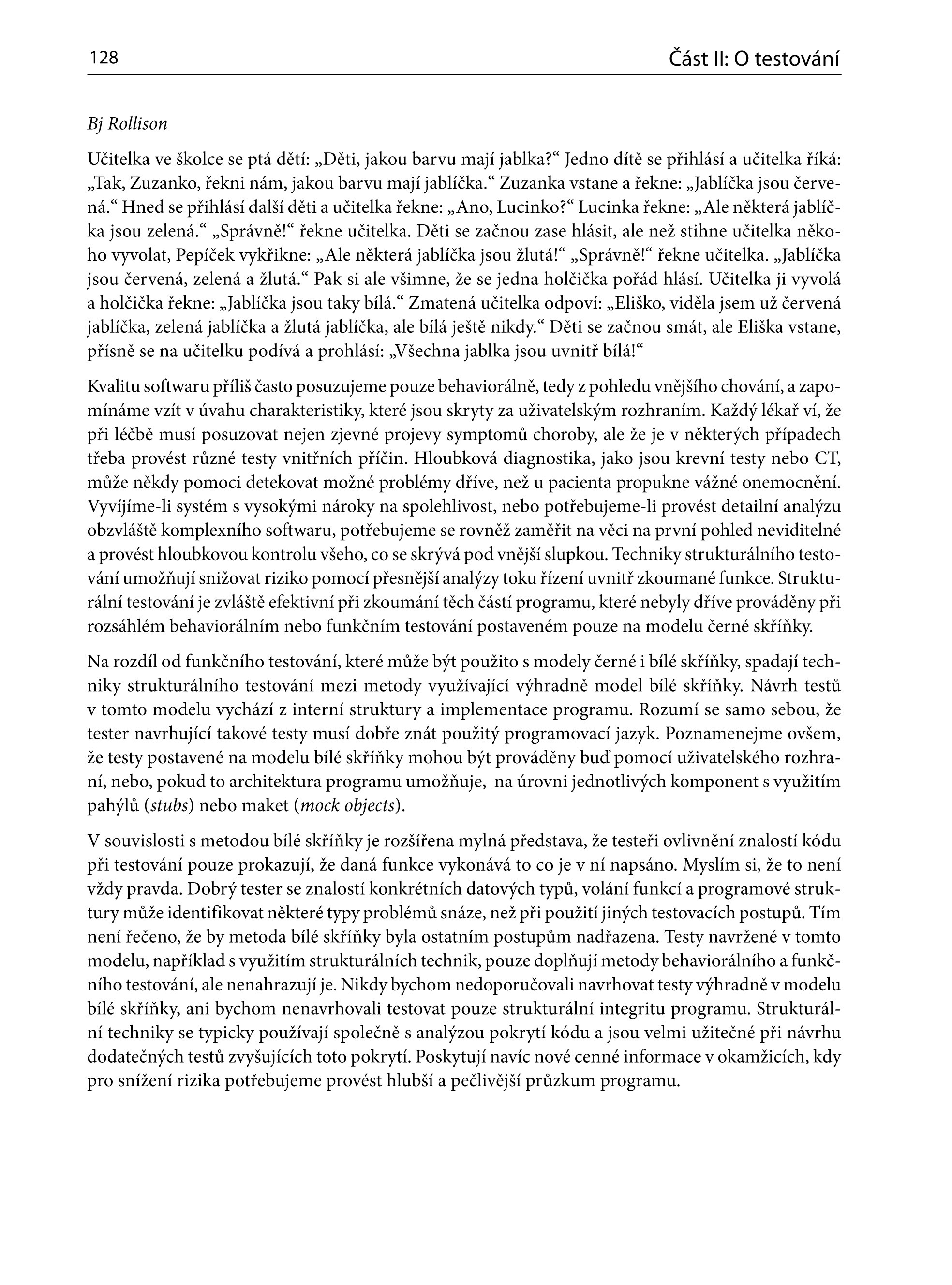 Trojice autorů, kteří jsou dlouhodobými experty společnosti Microsoft, stojí za testováním softwarových produktů s miliony řádků zdrojového kódu. Ve své knize vás seznámí nejen s důležitostí testování v průběhu celého procesu vzniku softwaru, ale i s nejzásadnějšími postupy a technikami, jak pomocí testování odstranit co nejvíce chyb. Kromě rad věnovaných vlastnímu testování se seznámíte i s postupy, jak optimálně proces testování zvládnout z manažerského hlediska.